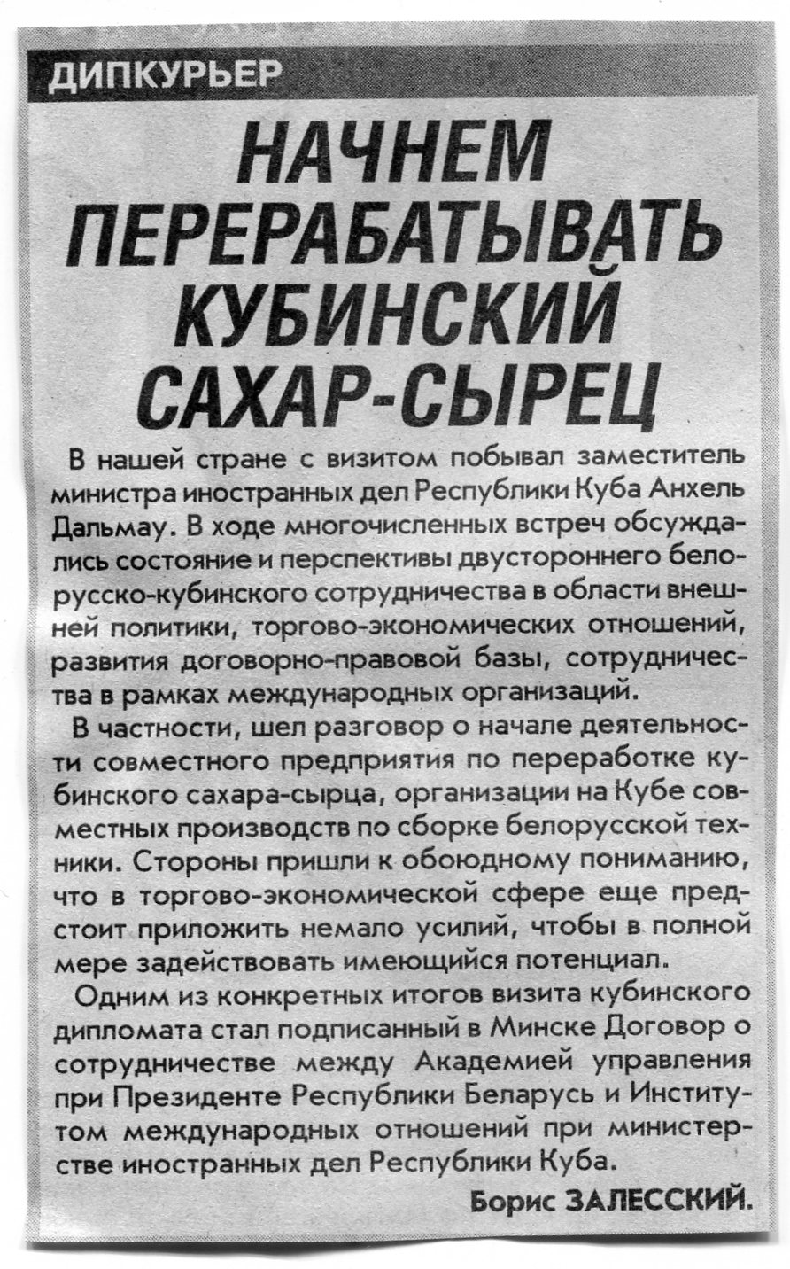 Залесский, Б. Начнем перерабатывать кубинский сахар-сырец / Б. Залесский // Вечерний Минск. - 2001. - 31 окт.