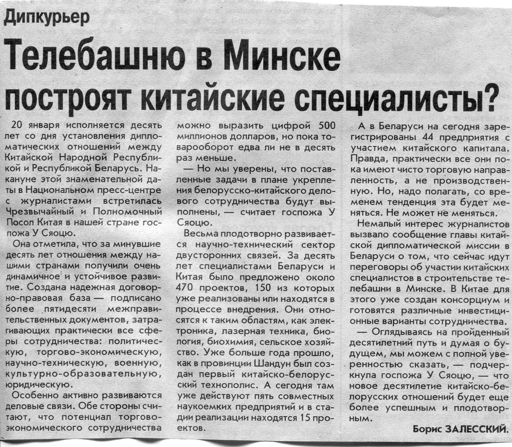 Залесский, Б. Телебашню в Минске построят китайские специалисты? / Б. Залесский // Вечерний Минск . - 2002. - 16 янв.