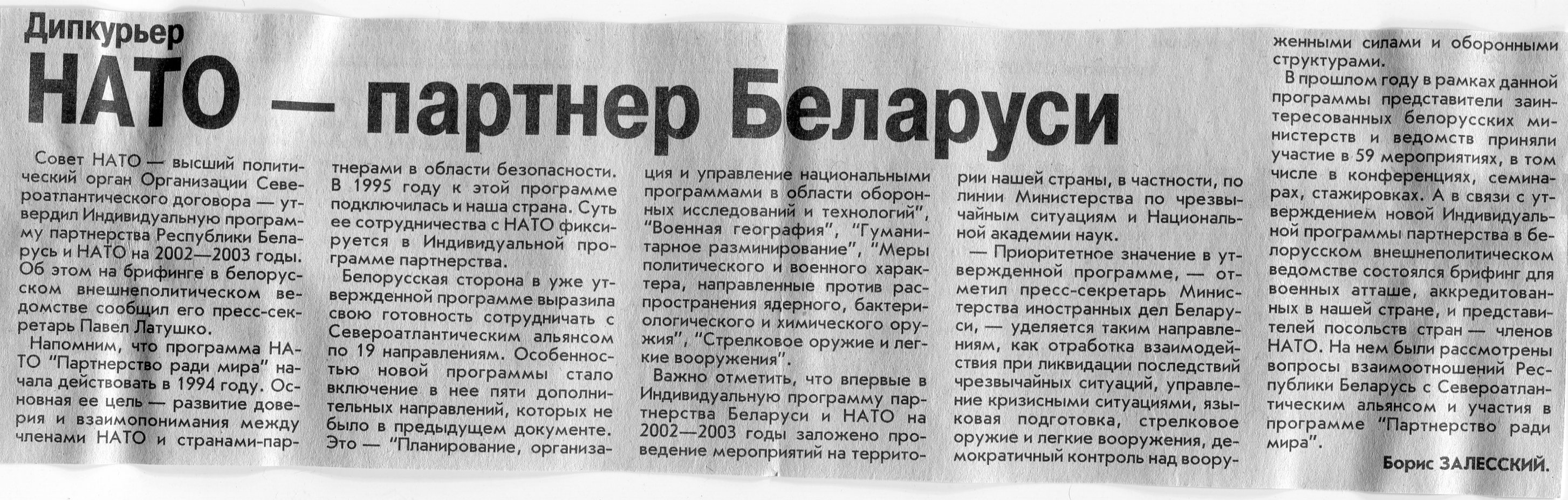 Залесский, Б. НАТО - партнер Беларуси / Б. Залесский // Вечерний Минск. - 2002. - 20 мар.