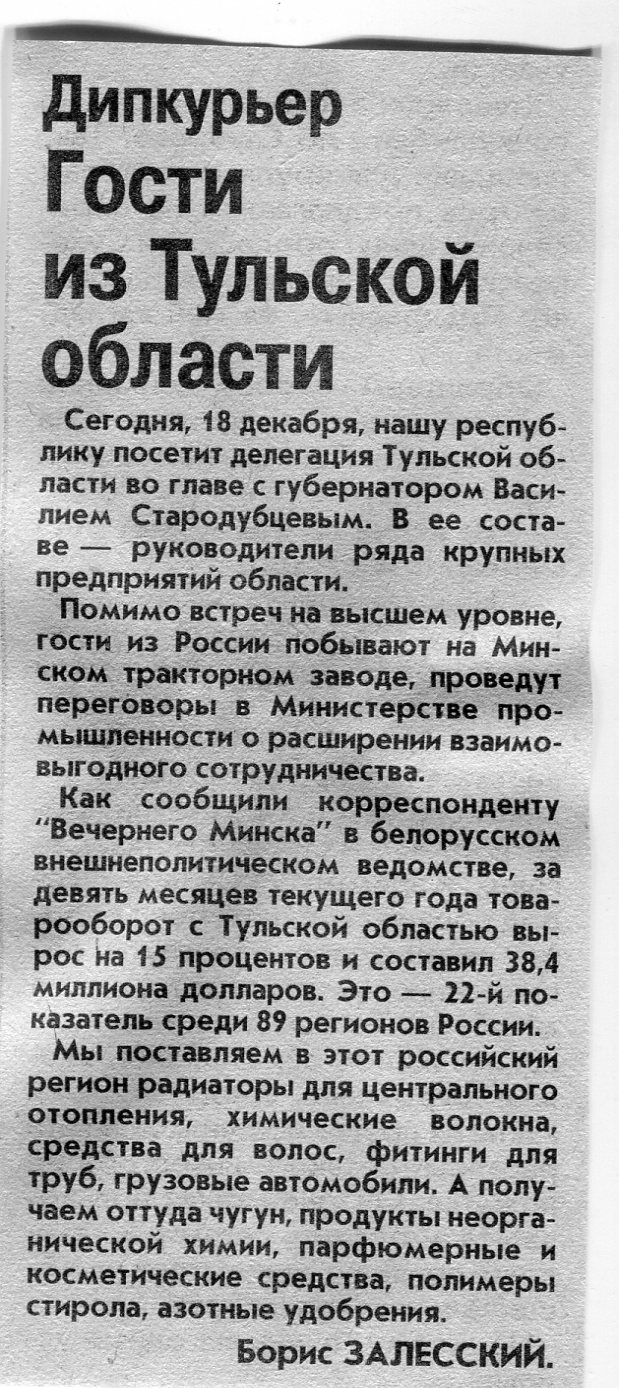 Залесский, Б. Гости из Тульской области / Б. Залесский // Вечерний Минск. - 2001. - 18 дек.