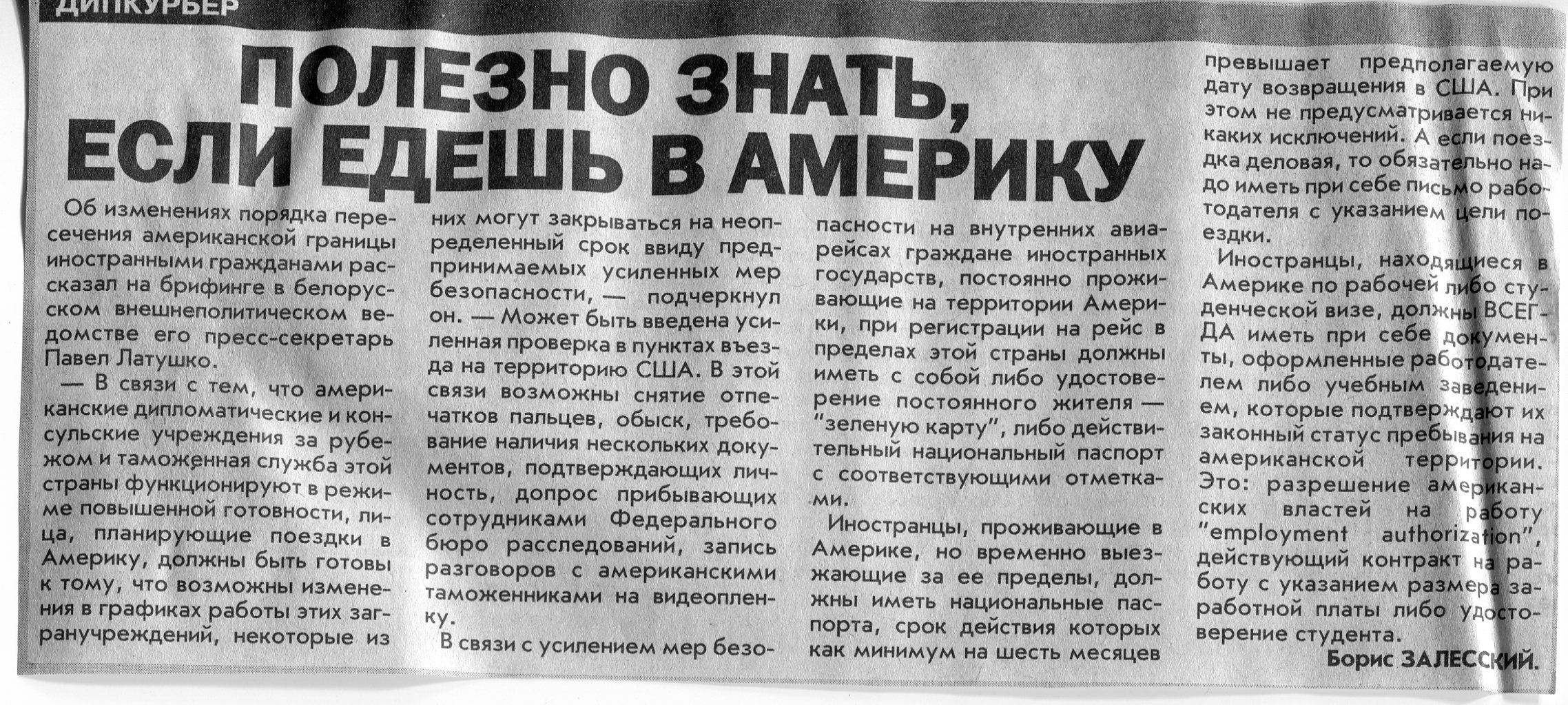 Залесский, Б. Полезно знать, если едешь в Америку / Б. Залесский // Вечерний Минск. - 2001. - 22 нояб.