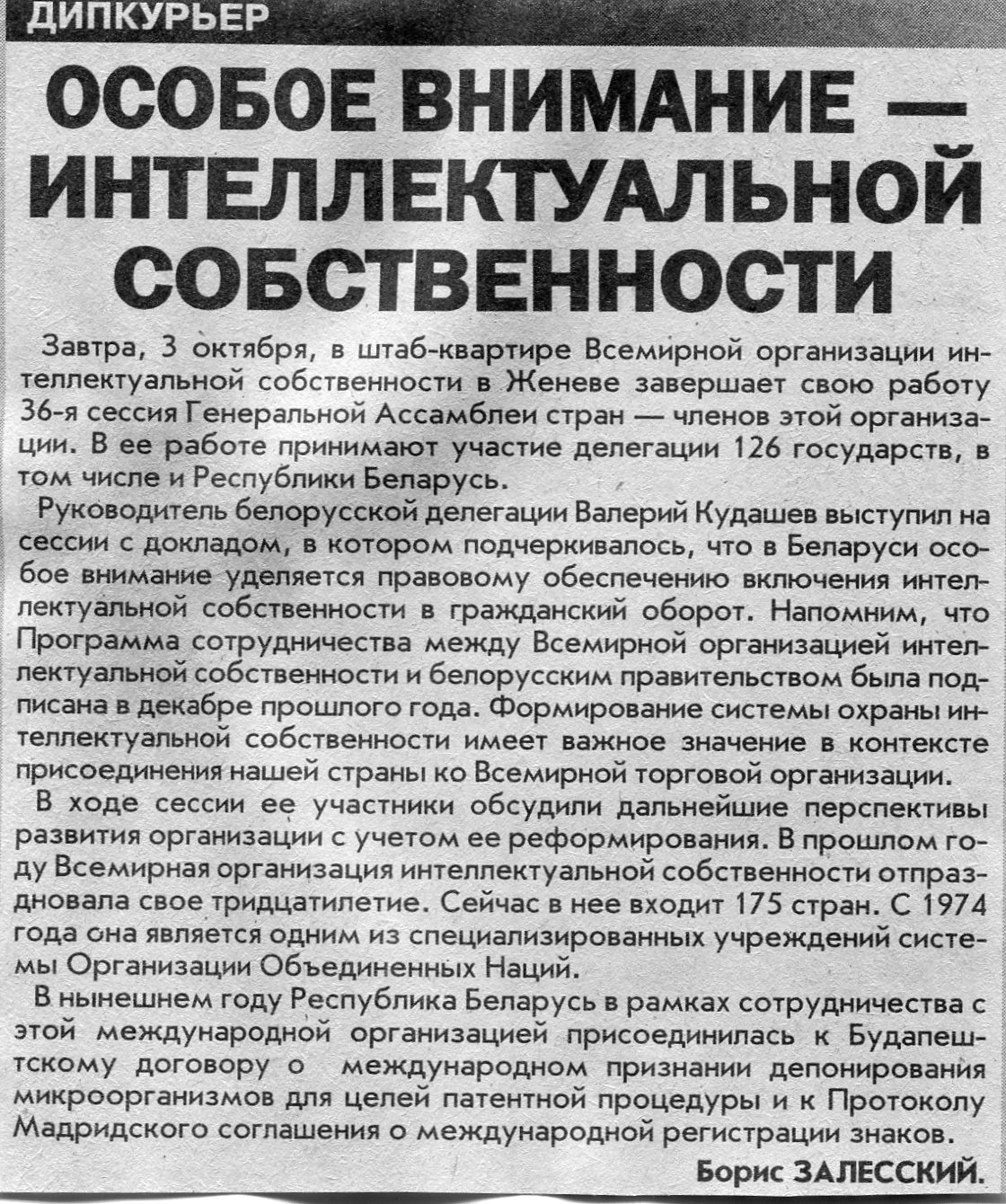 Залесский, Б. Особое внимание - интеллектуальной собственности / Б. Залесский // Вечерний Минск. - 2001. - 2 окт.