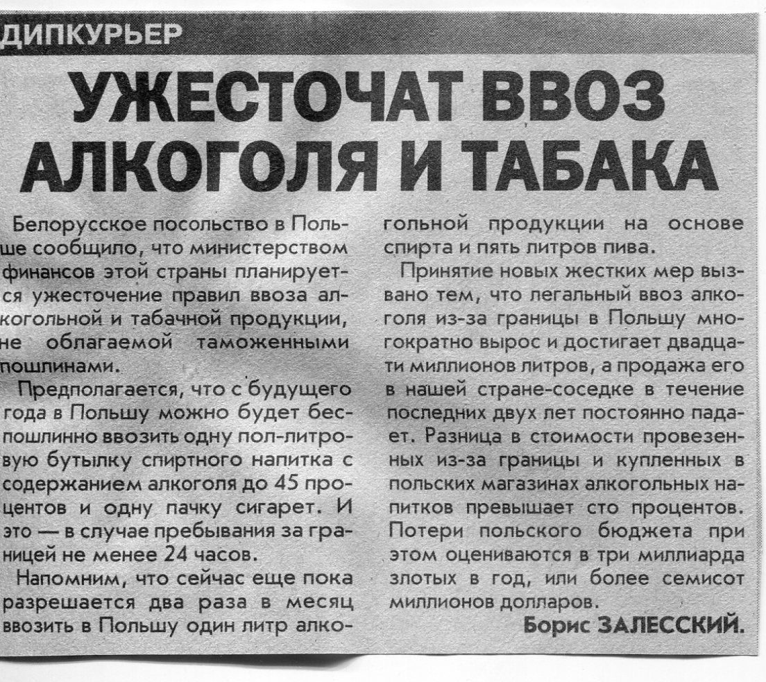 Залесский, Б. Ужесточат ввоз алкоголя и табака / Б. Залесский // Вечерний Минск. - 2001. - 10 окт.