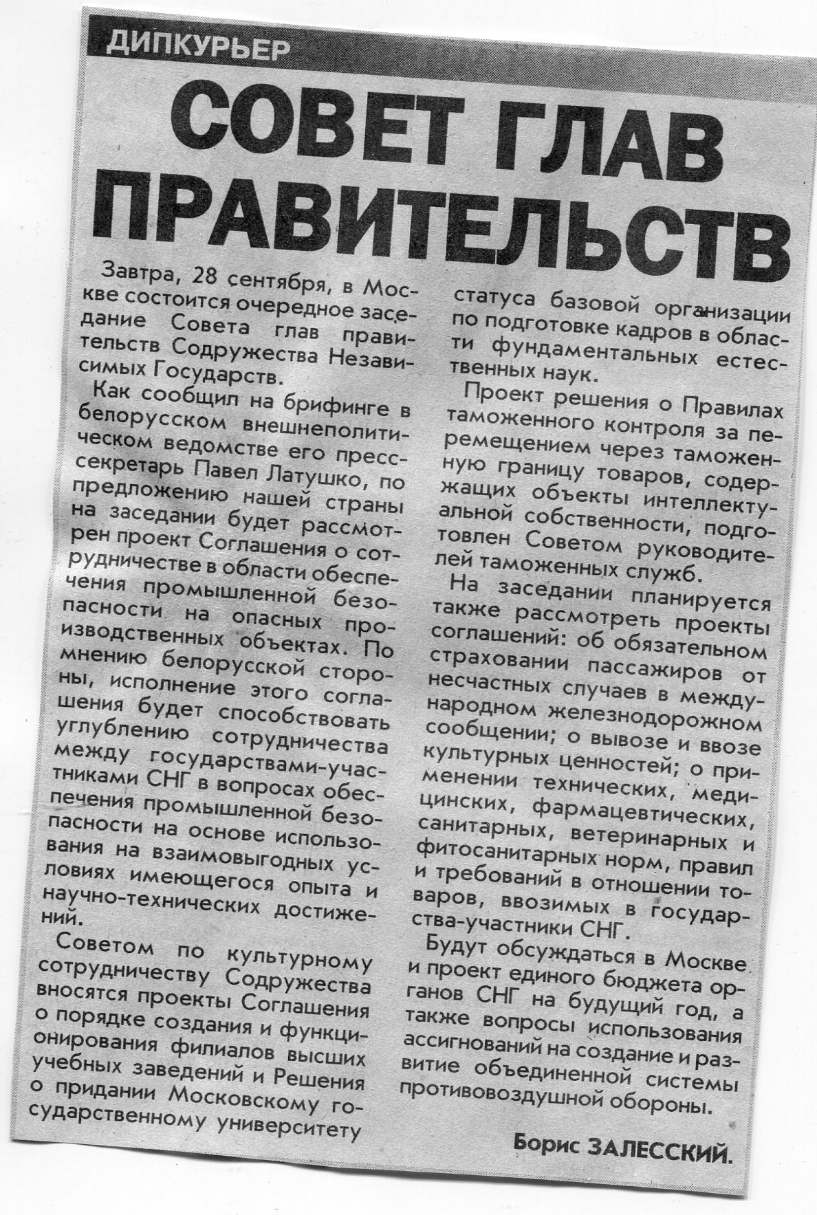 Залесский, Б. Совет глав правительств / Б. Залесский // Вечерний Минск. - 2001. - 27 сент.