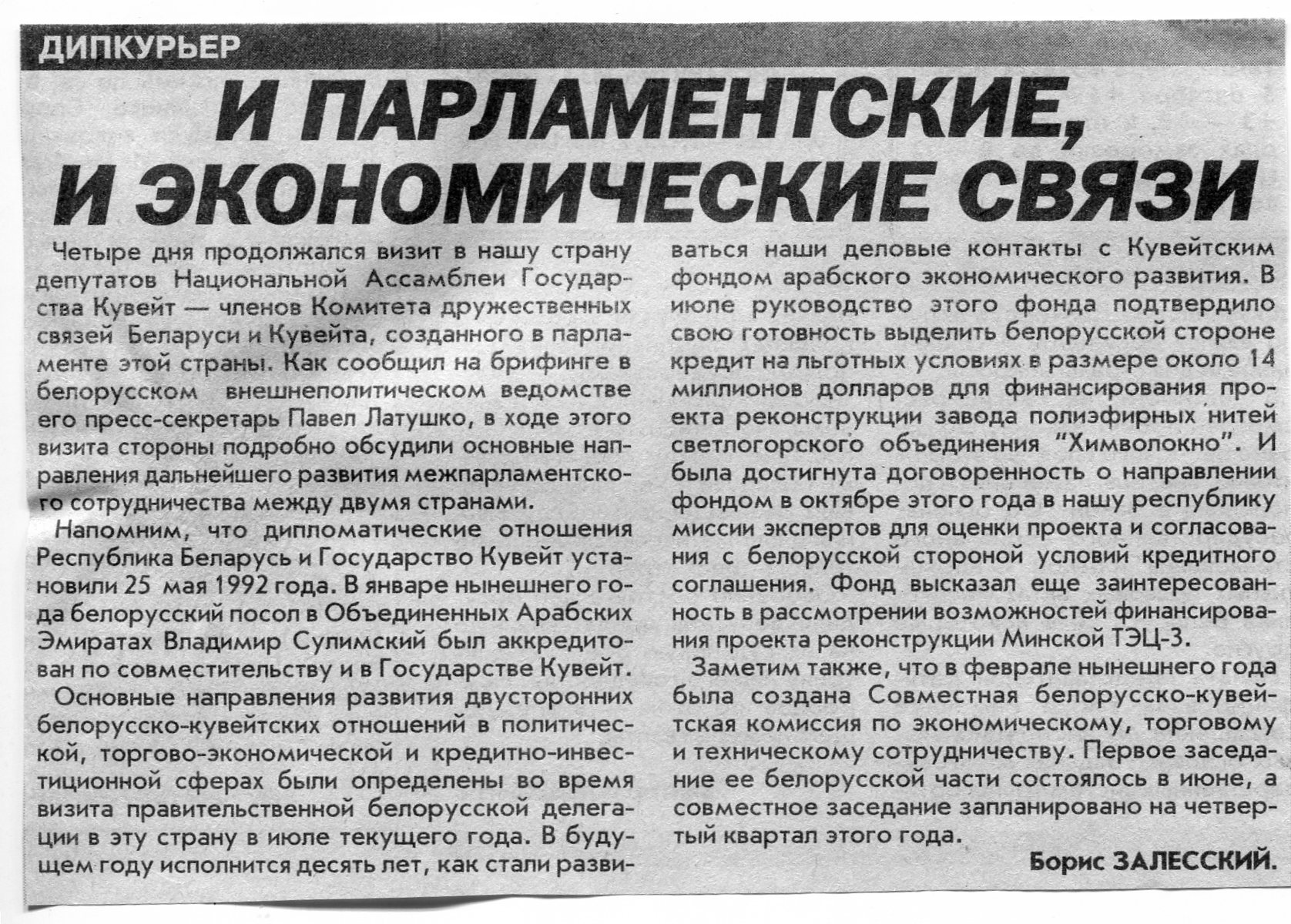 Залесский, Б. И парламентские, и экономические связи / Б. Залесский // Вечерний Минск. - 2001. - 4 окт.
