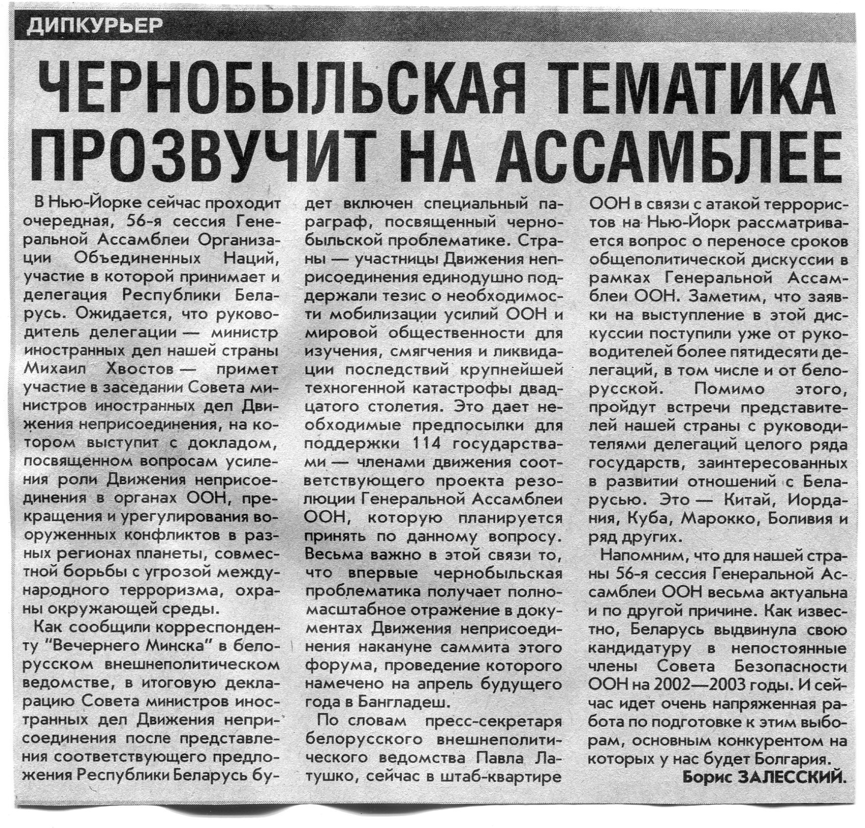 Залесский, Б. Чернобыльская тематика прозвучит на ассамблее / Б. Залесский // Вечерний Минск. - 2001. - 26 сент.