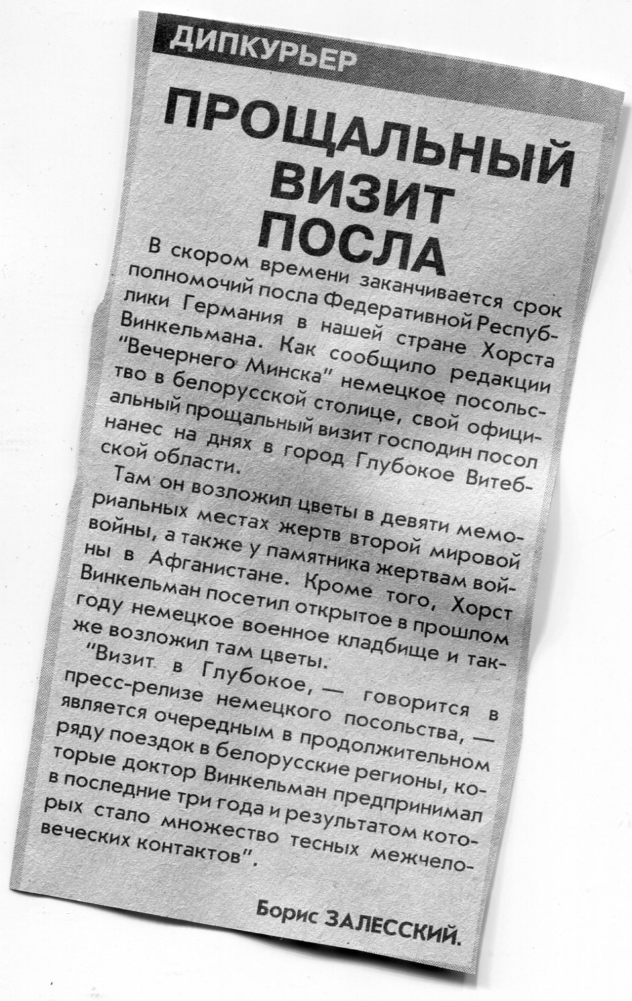 Залесский, Б. Прощальный визит посла / Б. Залесский // Вечерний Минск. - 2001. - 25 сент.