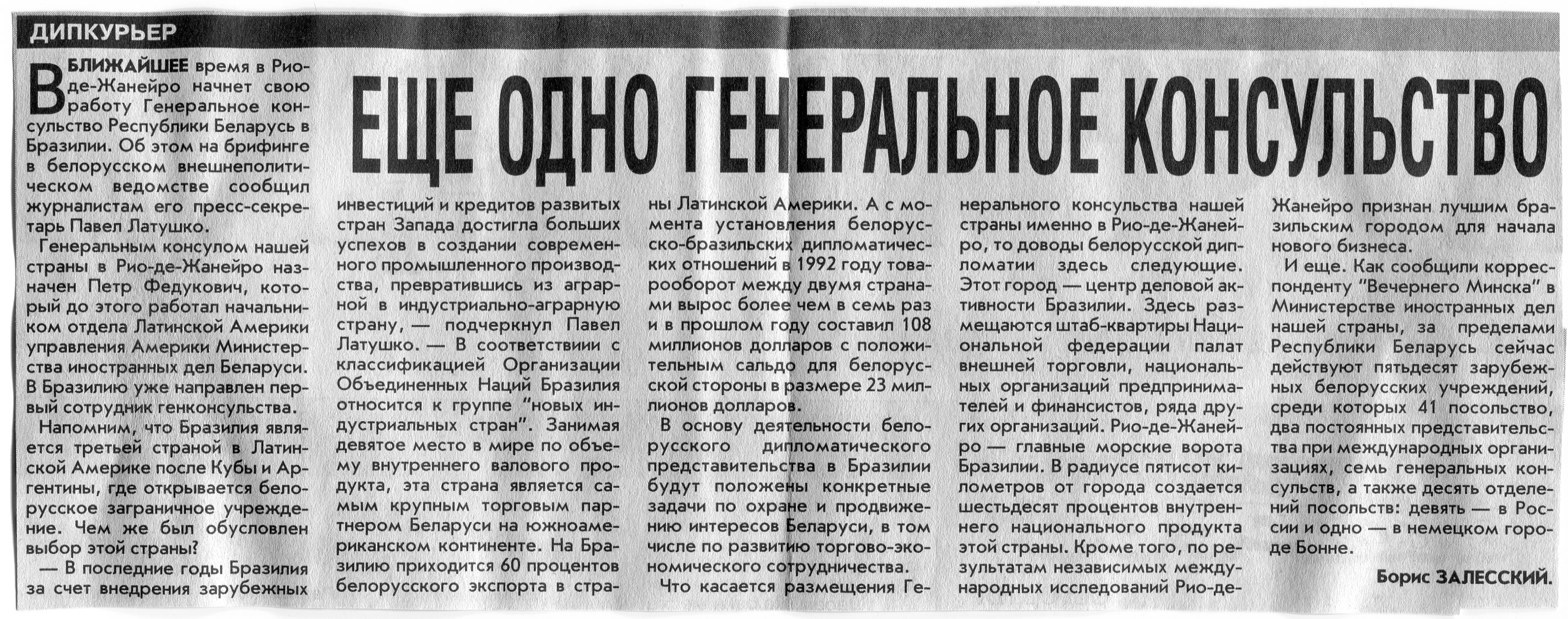 Залесский, Б. Еще одно генеральное консульство / Б. Залесский // Вечерний Минск. - 2001.- 28 авг.