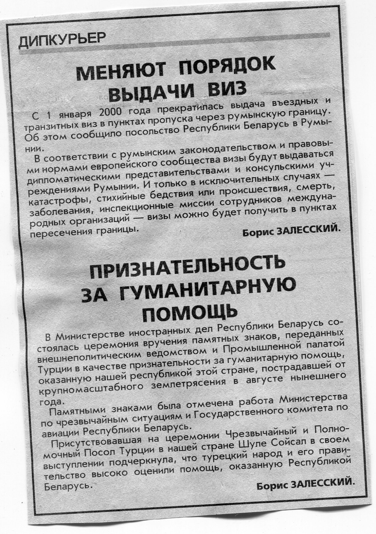 Залесский, Б. Дипкурьер / Б. Залесский // Вечерний Минск. - 2000. - 18 янв.