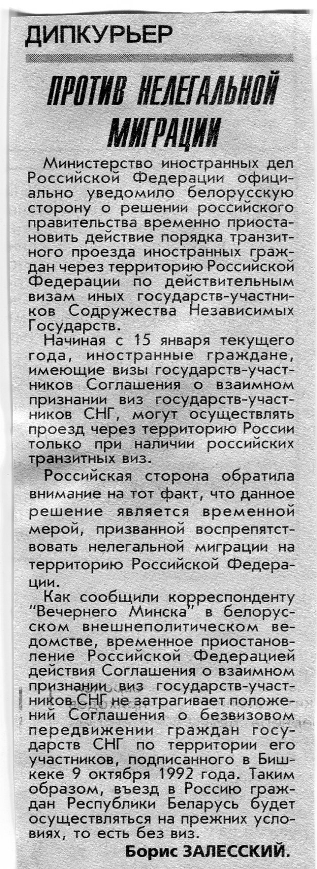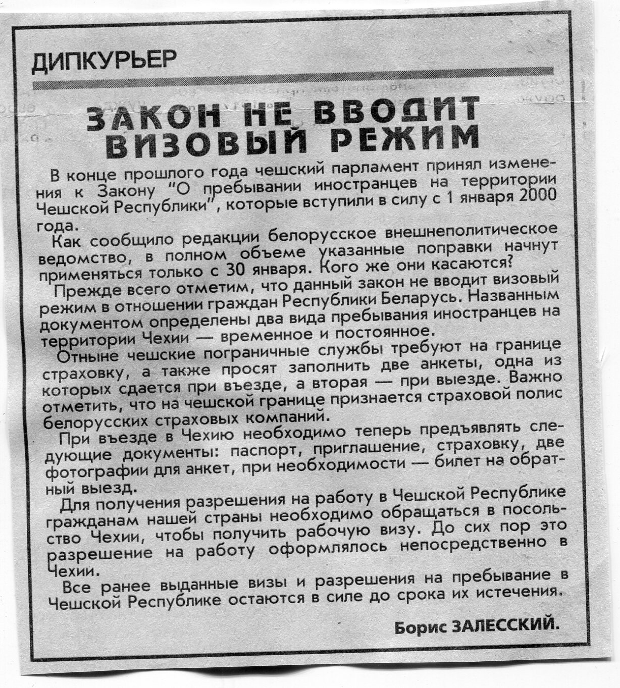 Залесский, Б. Закон не вводит визовый режим / Б. Залесский // Вечерний Минск. - 2000. - 12 янв.