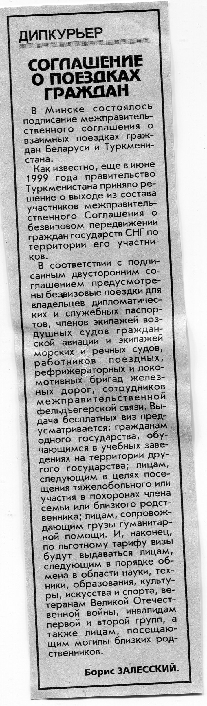 Залесский, Б. Соглашение о поездках граждан / Б. Залесский // Вечерний Минск. - 2000. - 6 янв.