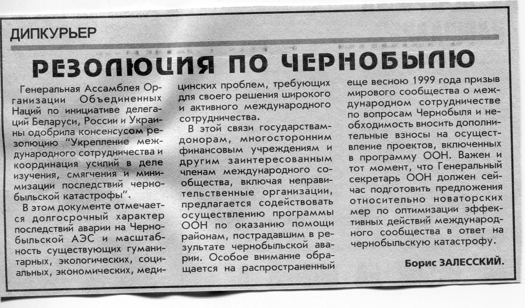 Залесский, Б. Резолюция по Чернобылю / Б. Залесский // Вечерний Минск. - 2000. - 17 янв.