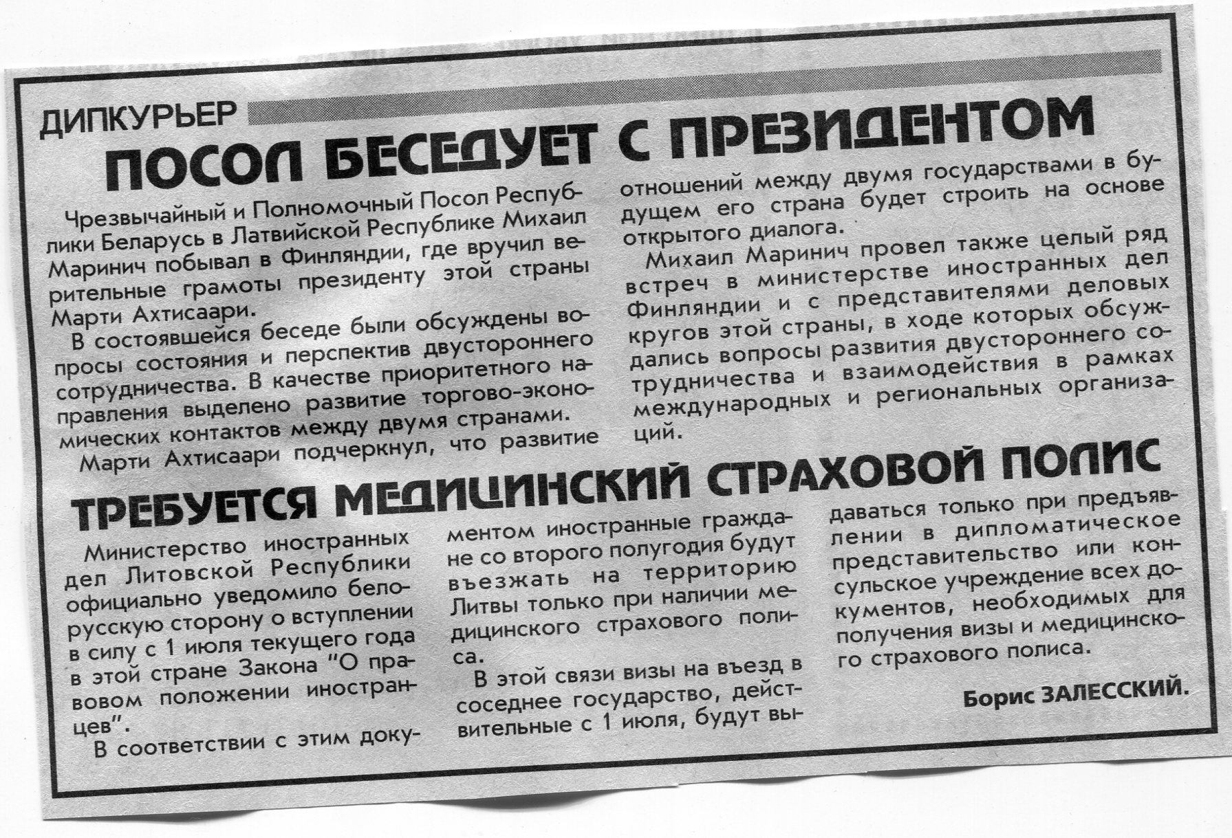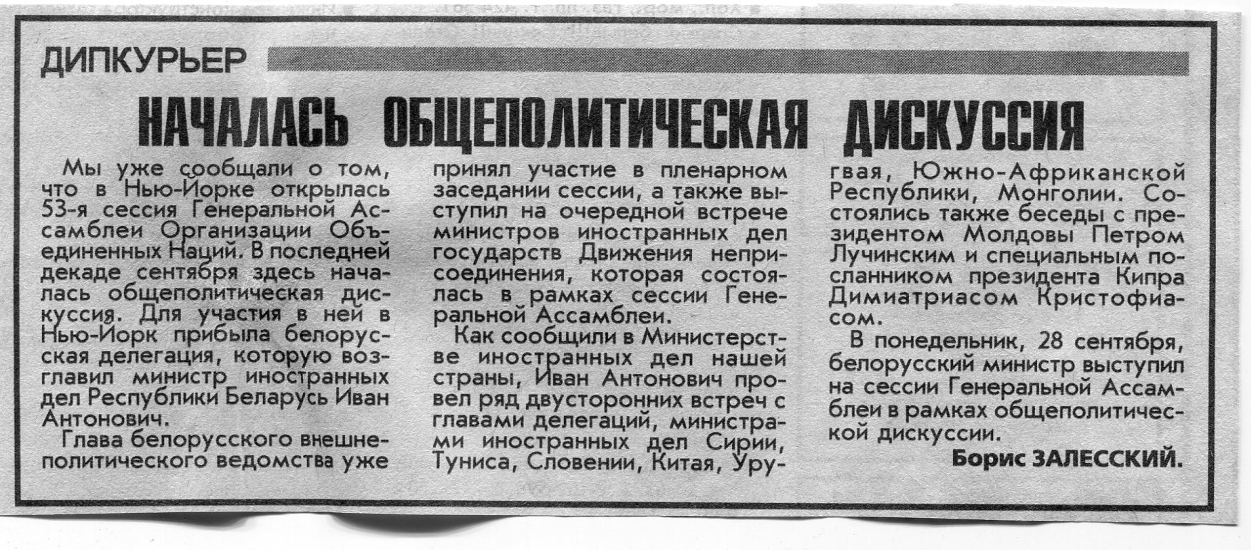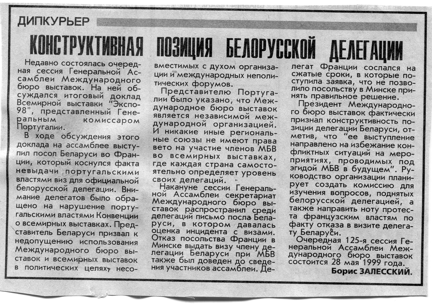 Залесский, Б. Дипкурьер / Б. Залесский // Вечерний Минск. - 1999. - 28 июн.