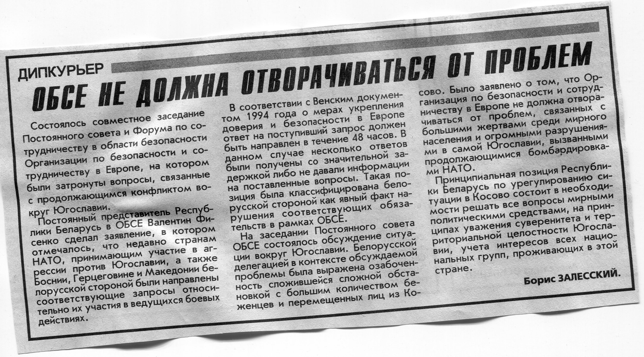 Залесский, Б. ОБСЕ не должна отворачиваться от проблем / Б. Залесский // Вечерний Минск. - 1999. - 19 мая.