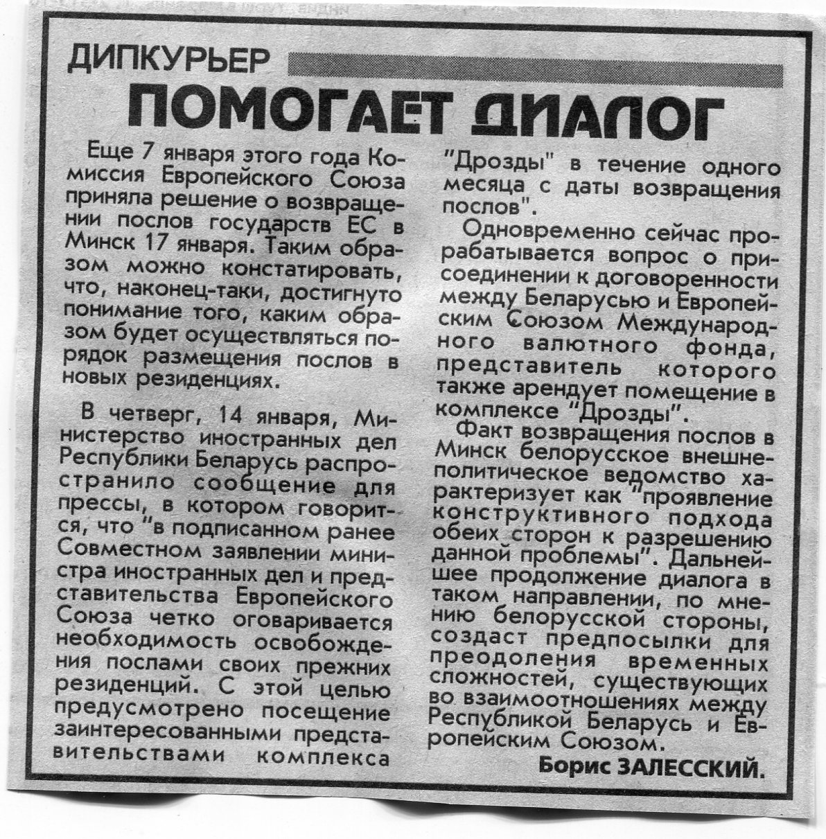 Залесский, Б. Помогает диалог / Б. Залесский // Вечерний Минск. - 1999. - 18 янв.