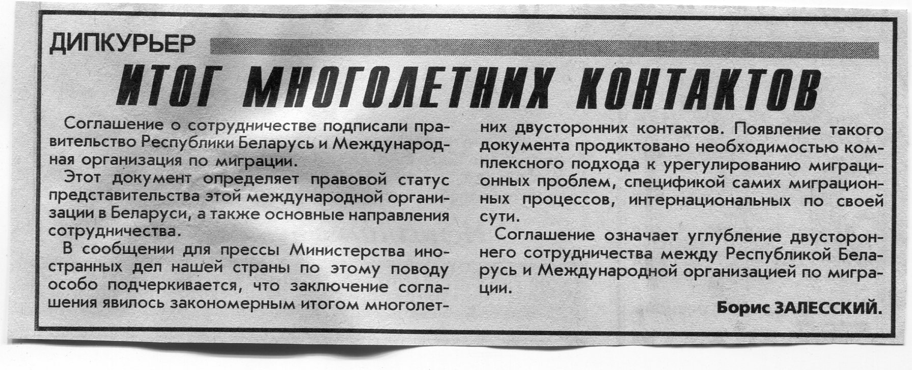 Залесский, Б. Итог многолетних контактов / Б. Залесский // Вечерний Минск. - 1998. - 28 июл.