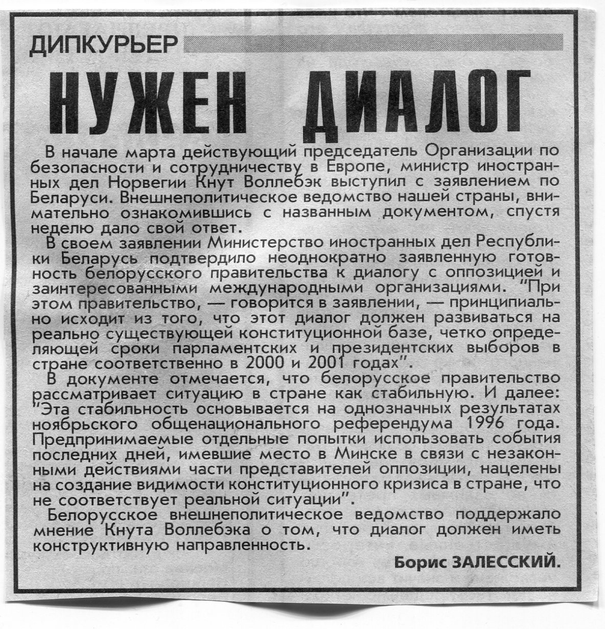 Залесский, Б. Нужен диалог / Б. Залесский // Вечерний Минск. - 1999. - 17 мар.