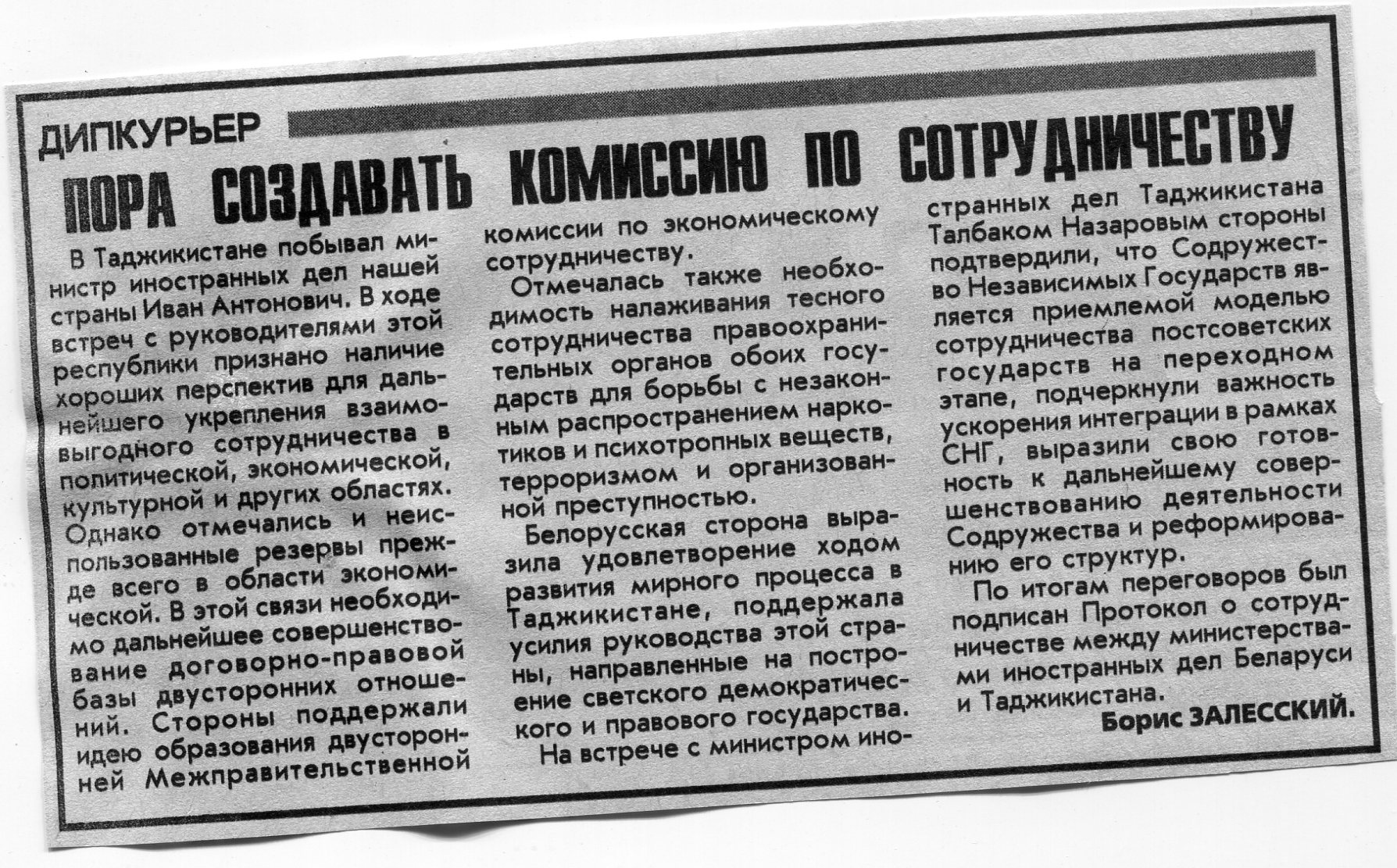 Залесский, Б. Пора создавать комиссию по сотрудничеству / Б. Залесский // Вечерний Минск. - 1998. - 22 июл.