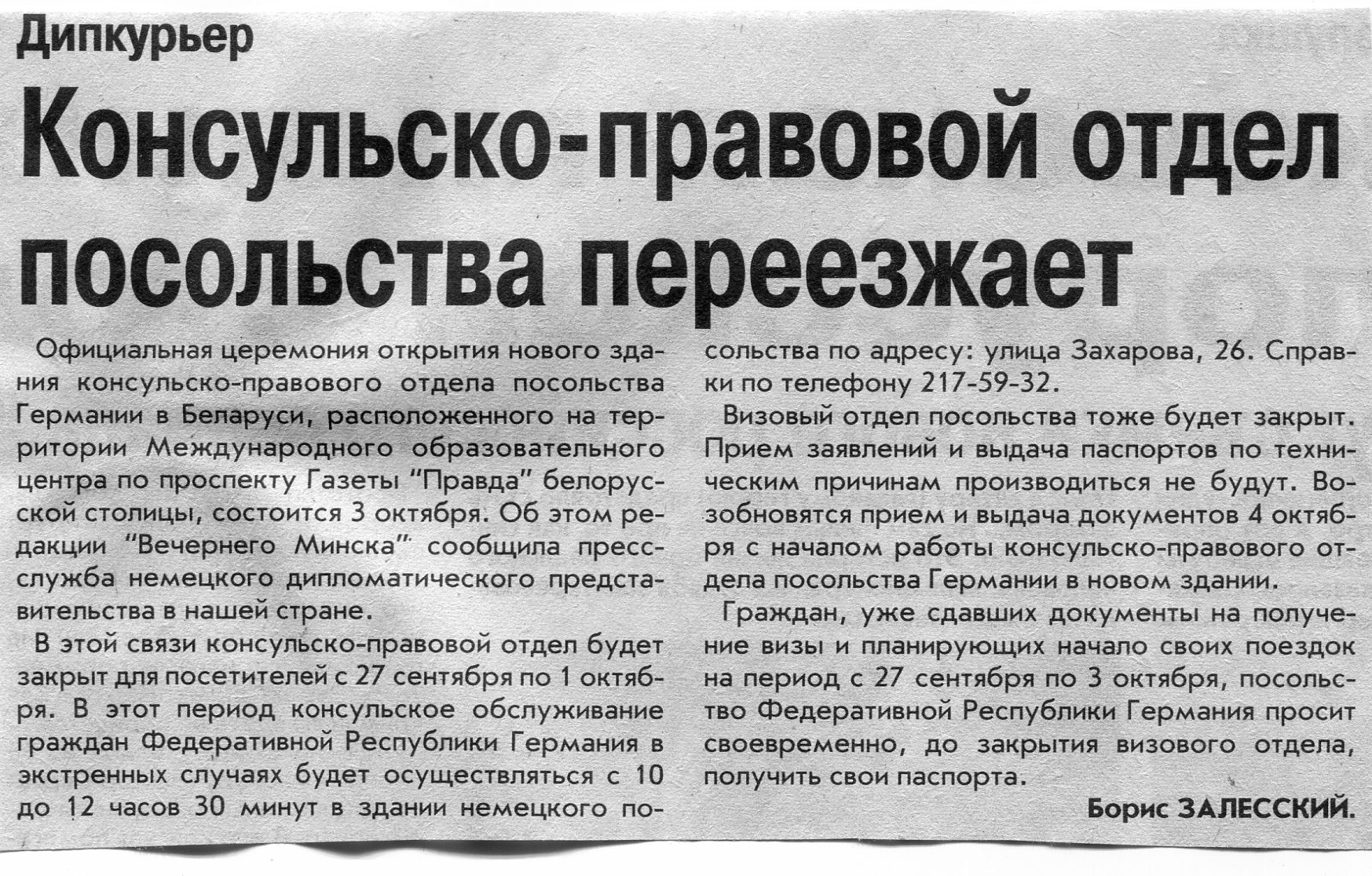 Залесский, Б. Консульско-правовой отдел посольства переезжает / Б. Залесский // Вечерний Минск. - 2004. - 15 сент.
