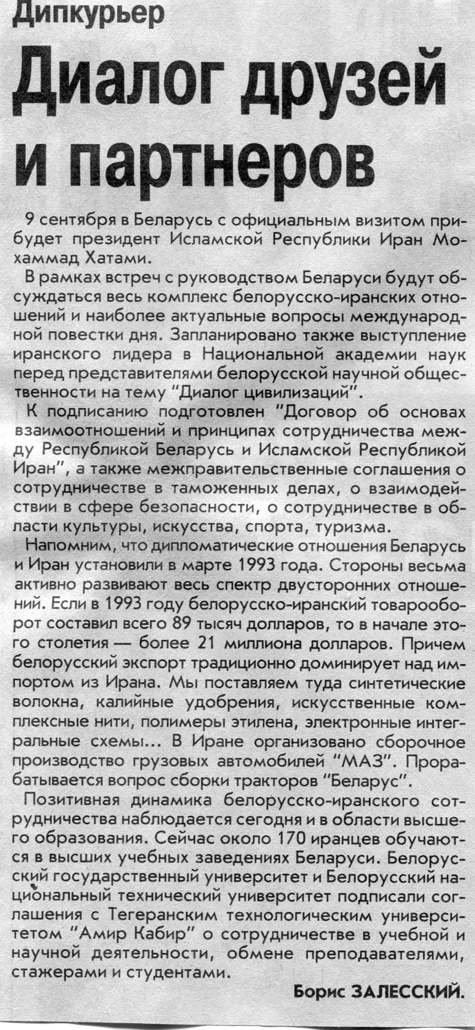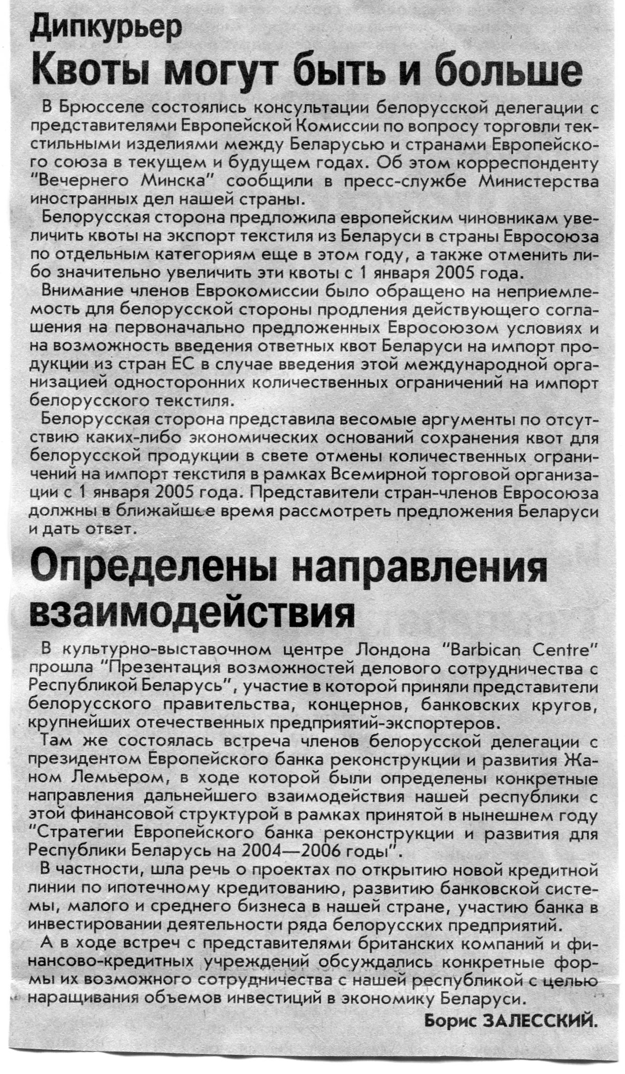 Залесский, Б. Диалог друзей и партнеров / Б. Залесский // Вечерний Минск. - 2004. - 6 сент.