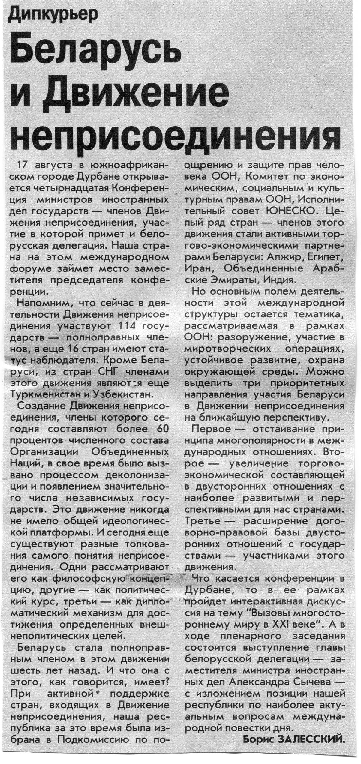 Залесский, Б. Беларусь и Движение неприсоединения / Б. Залесский // Вечерний Минск. - 2004. - 17 авг.