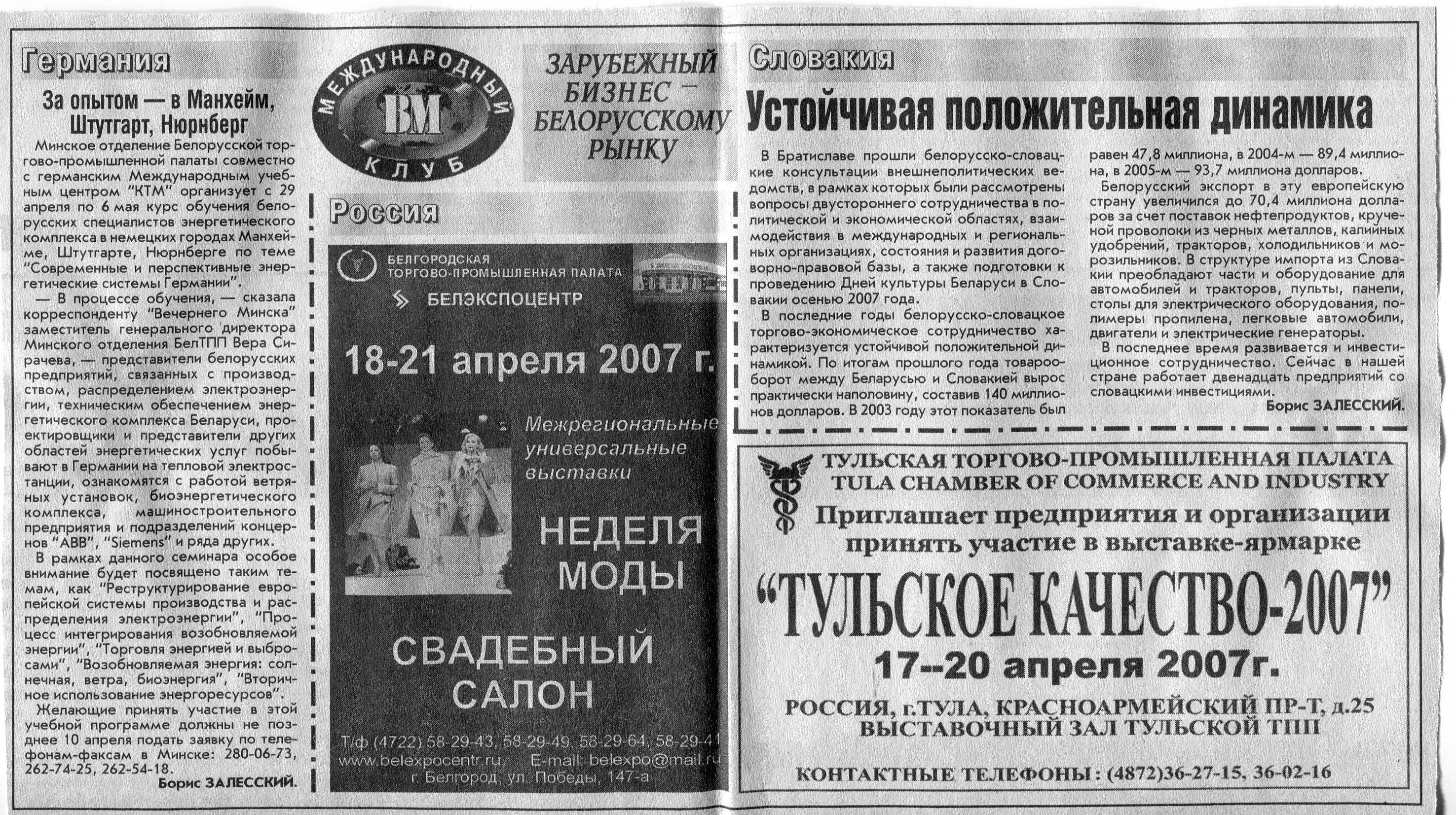 Европейский бизнес - белорусскому рынку // Вечерний Минск. - 2007. - 20 апр.