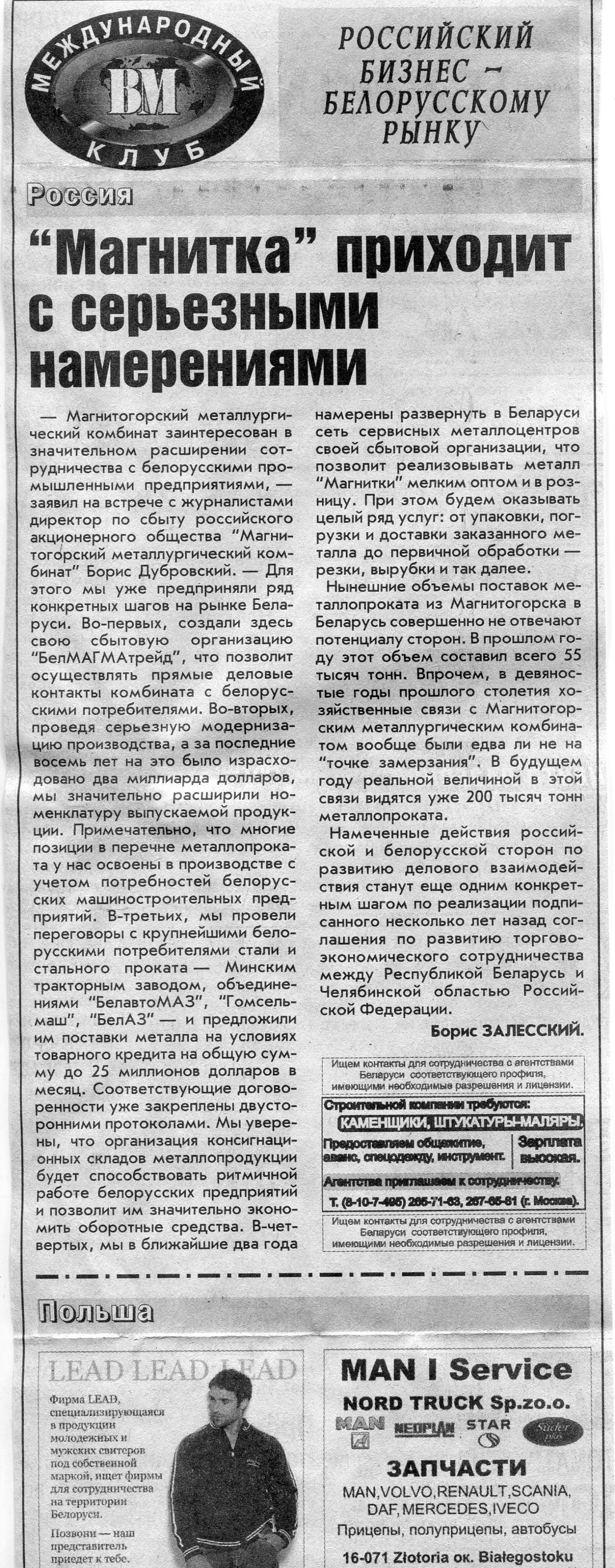 Российский бизнес - белорусскому рынку // Вечерний Минск. - 2006. - 13 сент.