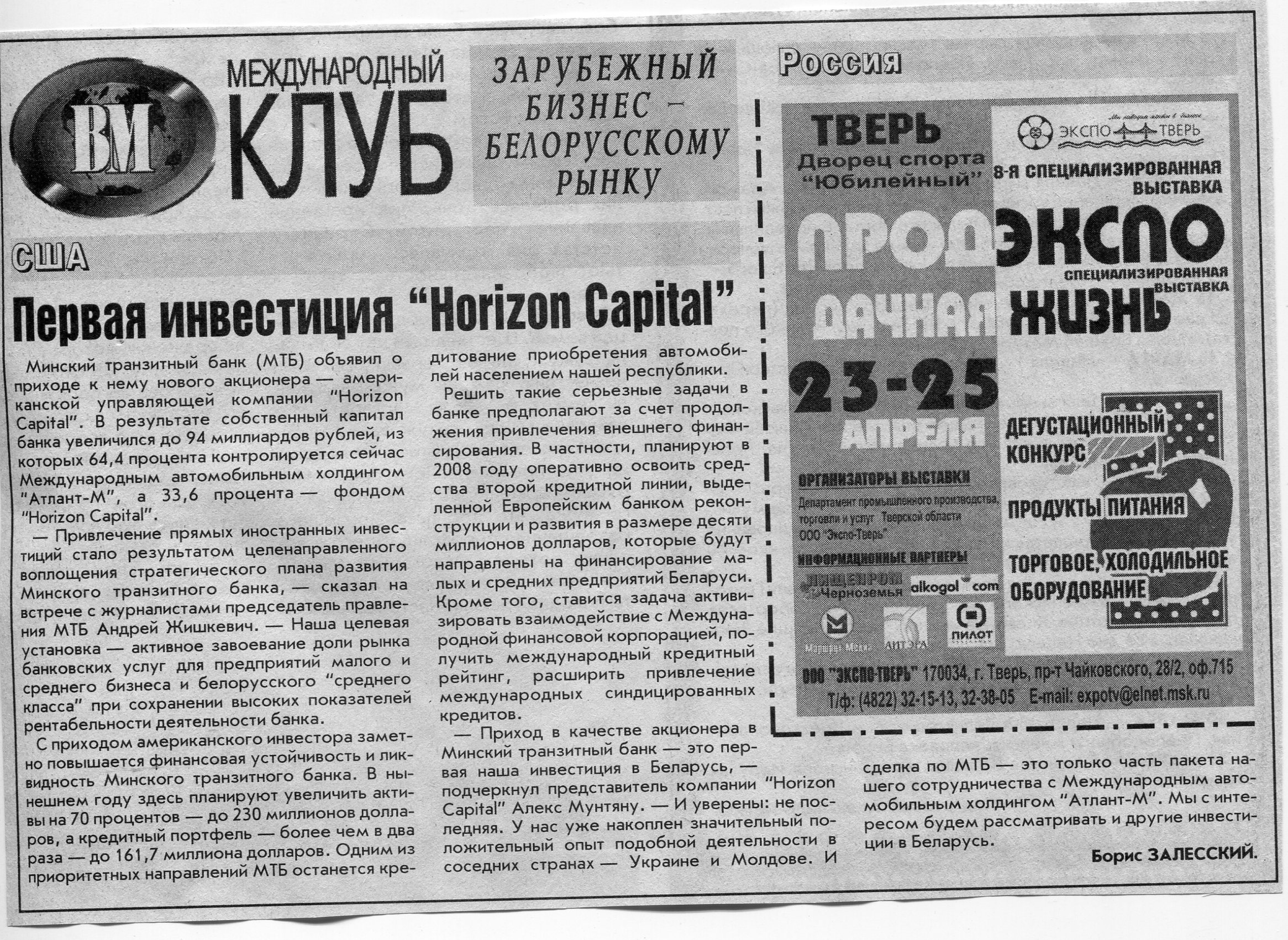 Зарубежный бизнес - белорусскому рынку // Вечерний Минск. - 2007. - 12 дек.