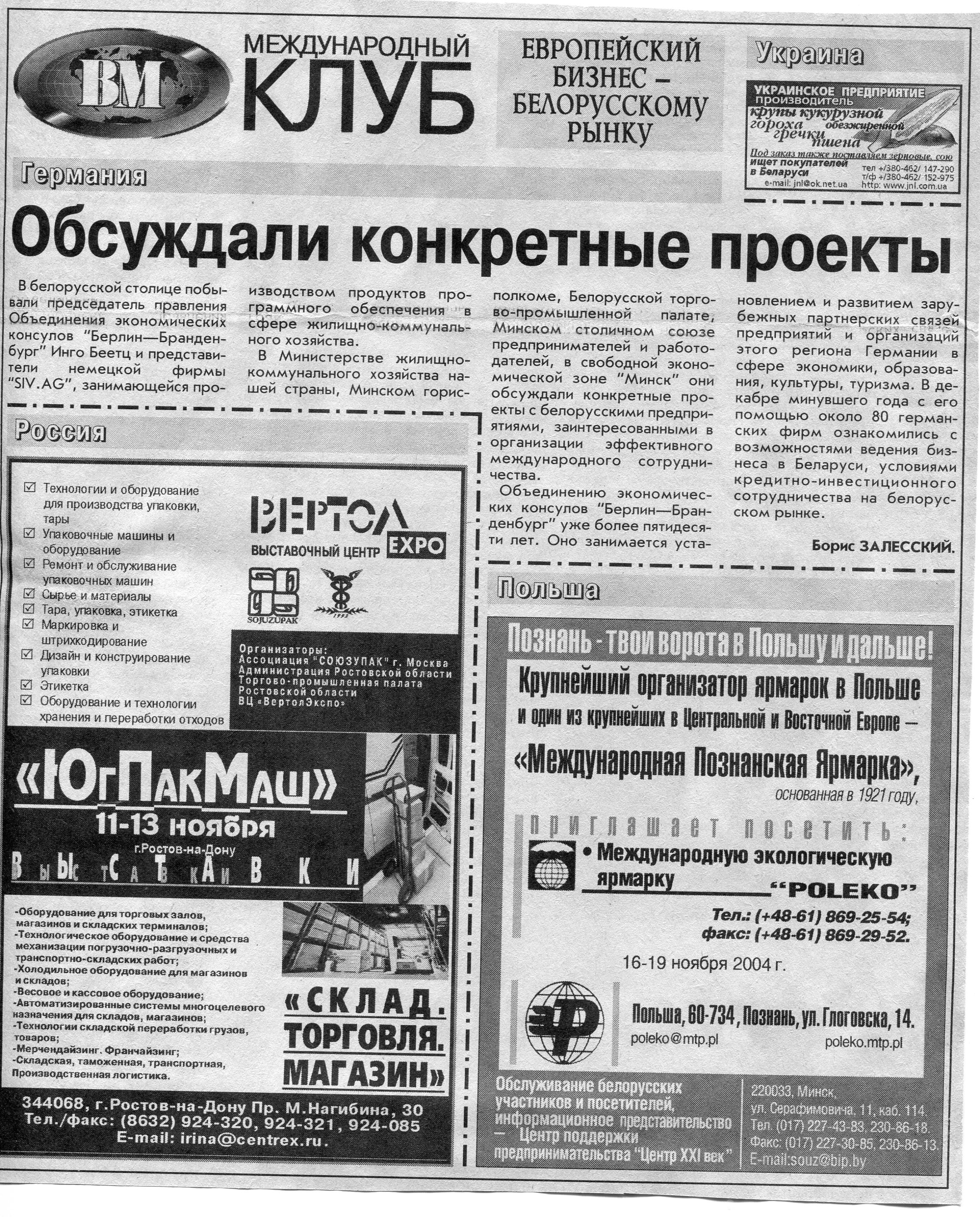 Европейский бизнес - белорусскому рынку // Вечерний Минск. - 2004. - 26 окт.