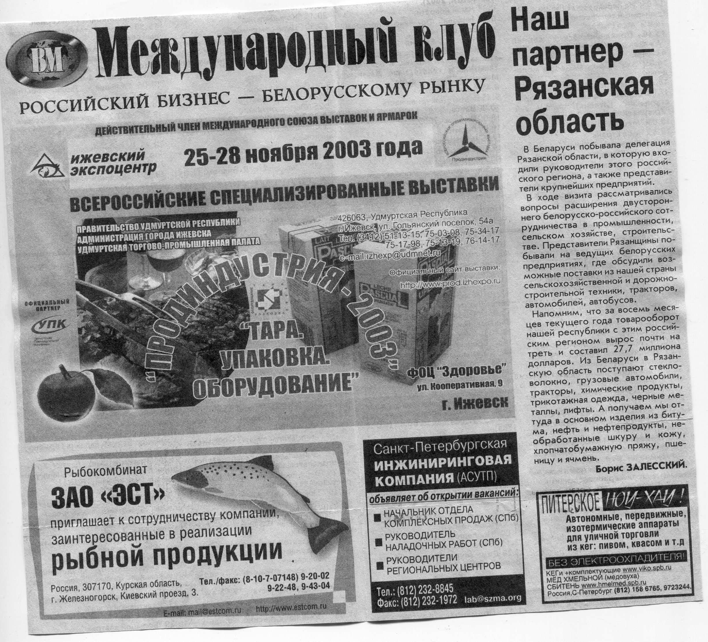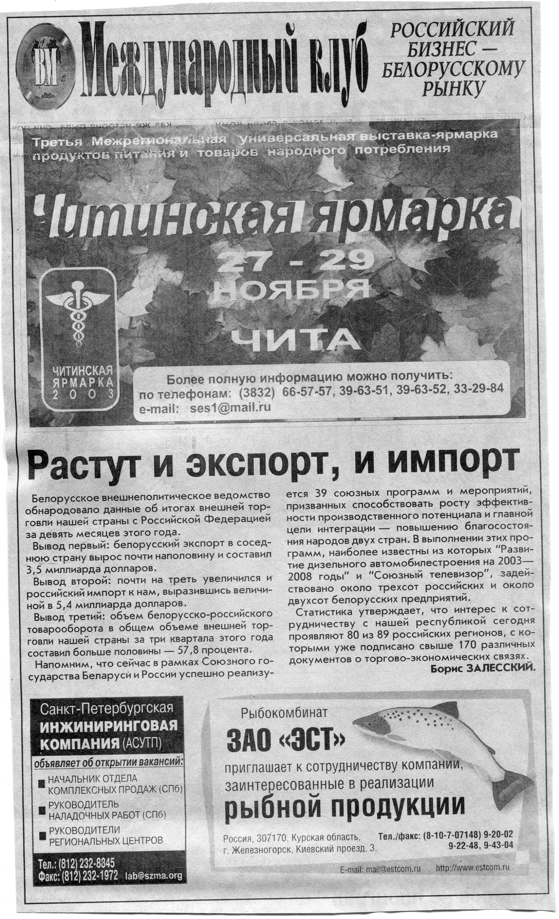 Российский бизнес - белорусскому рынку // Вечерний Минск. - 2003. - 14 нояб.
