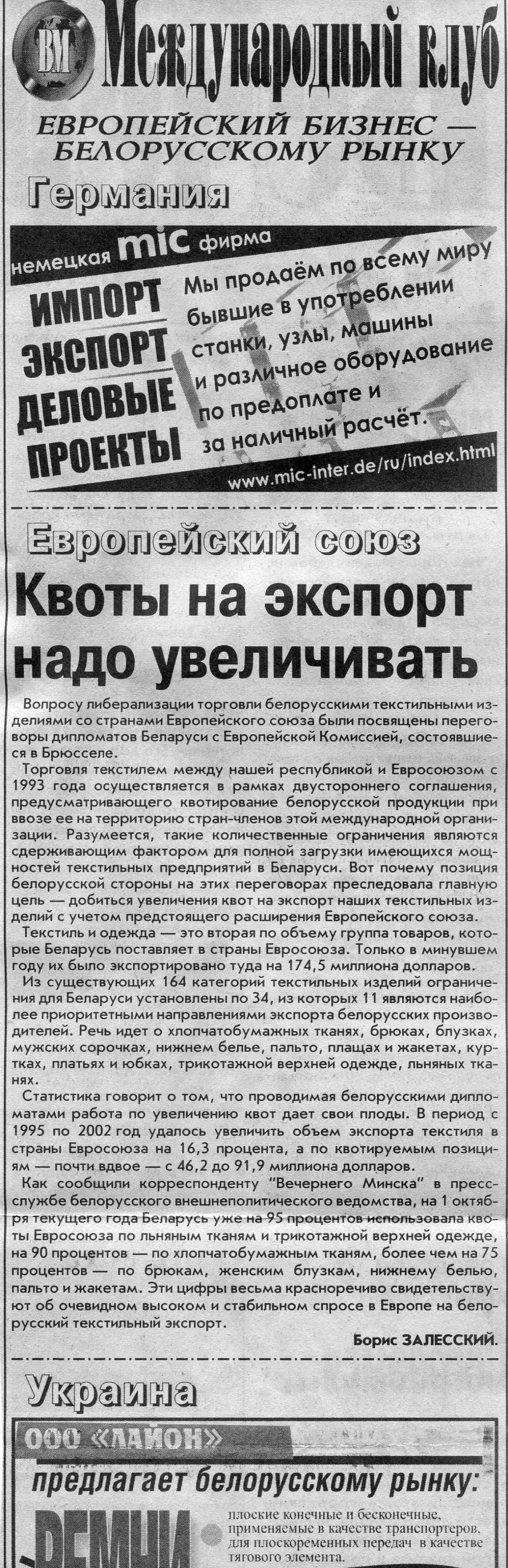 Европейский бизнес - белорусскому рынку // Вечерний Минск. - 2003. - 6 окт.