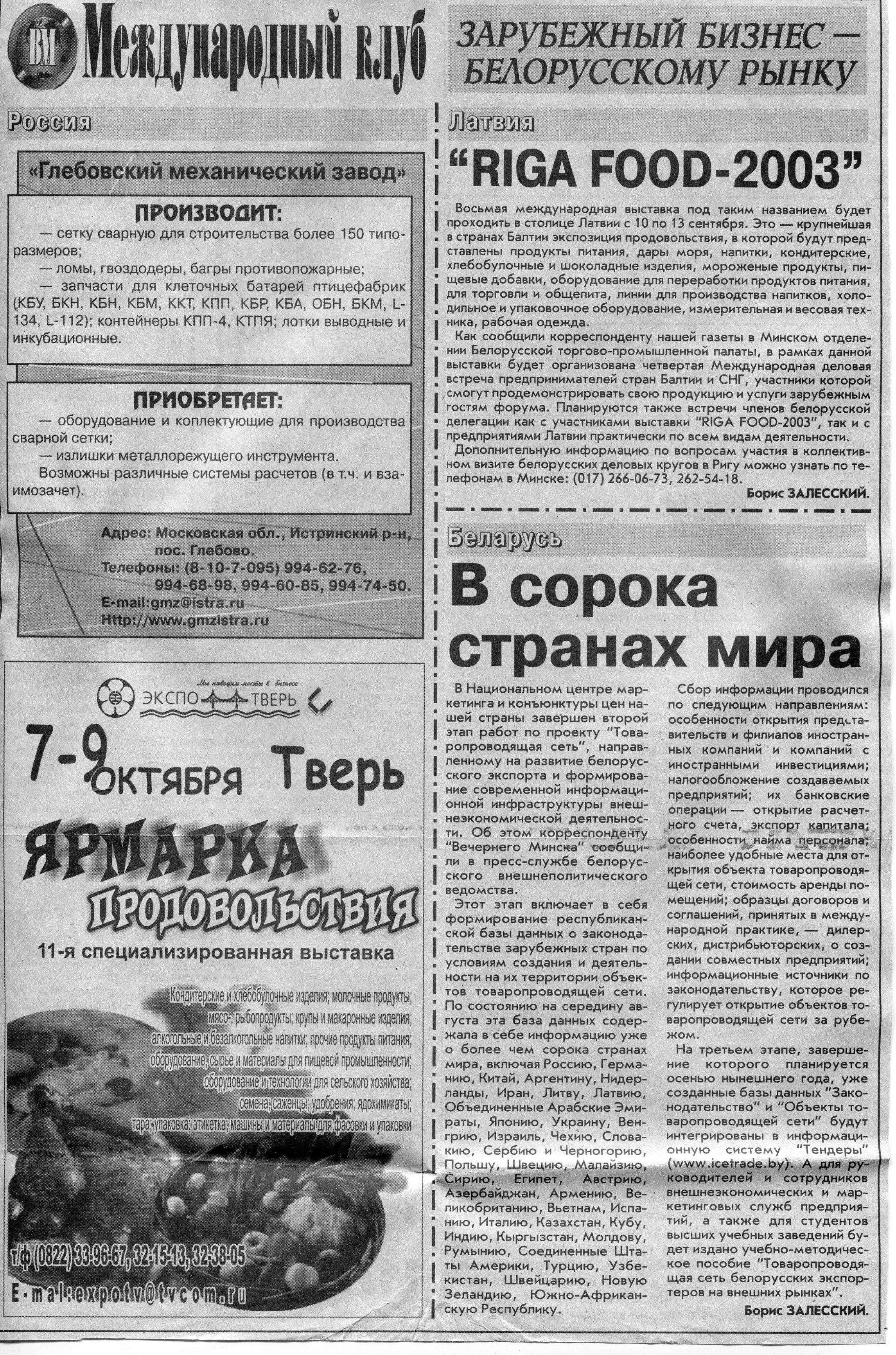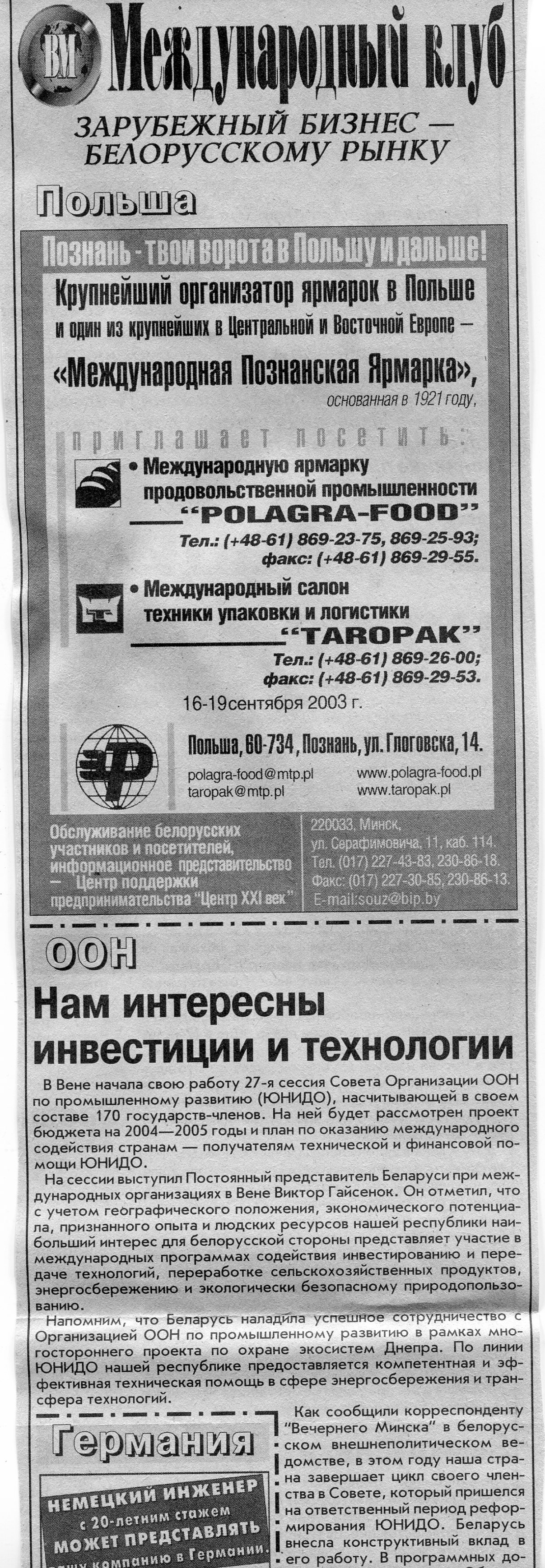 Зарубежный бизнес - белорусскому рынку // Вечерний Минск. - 2003. - 29 сент.