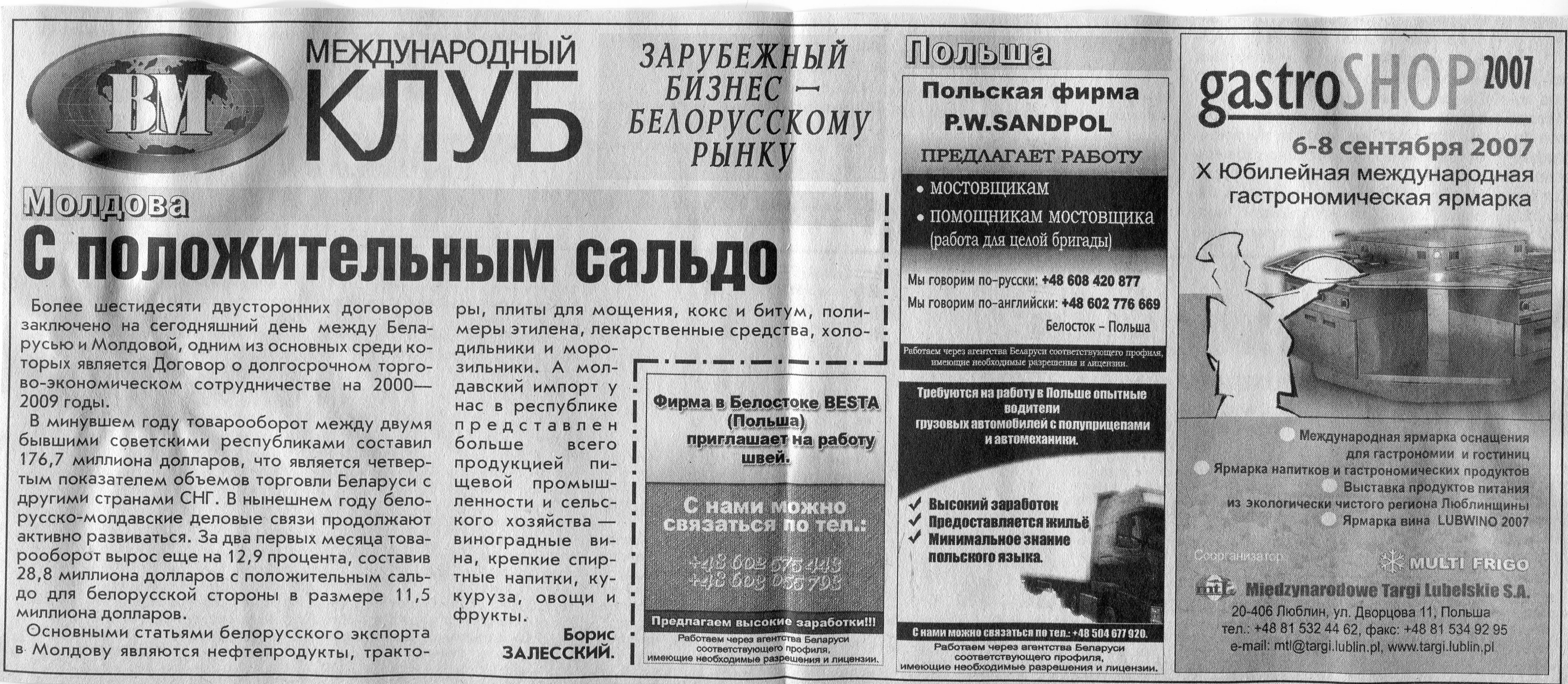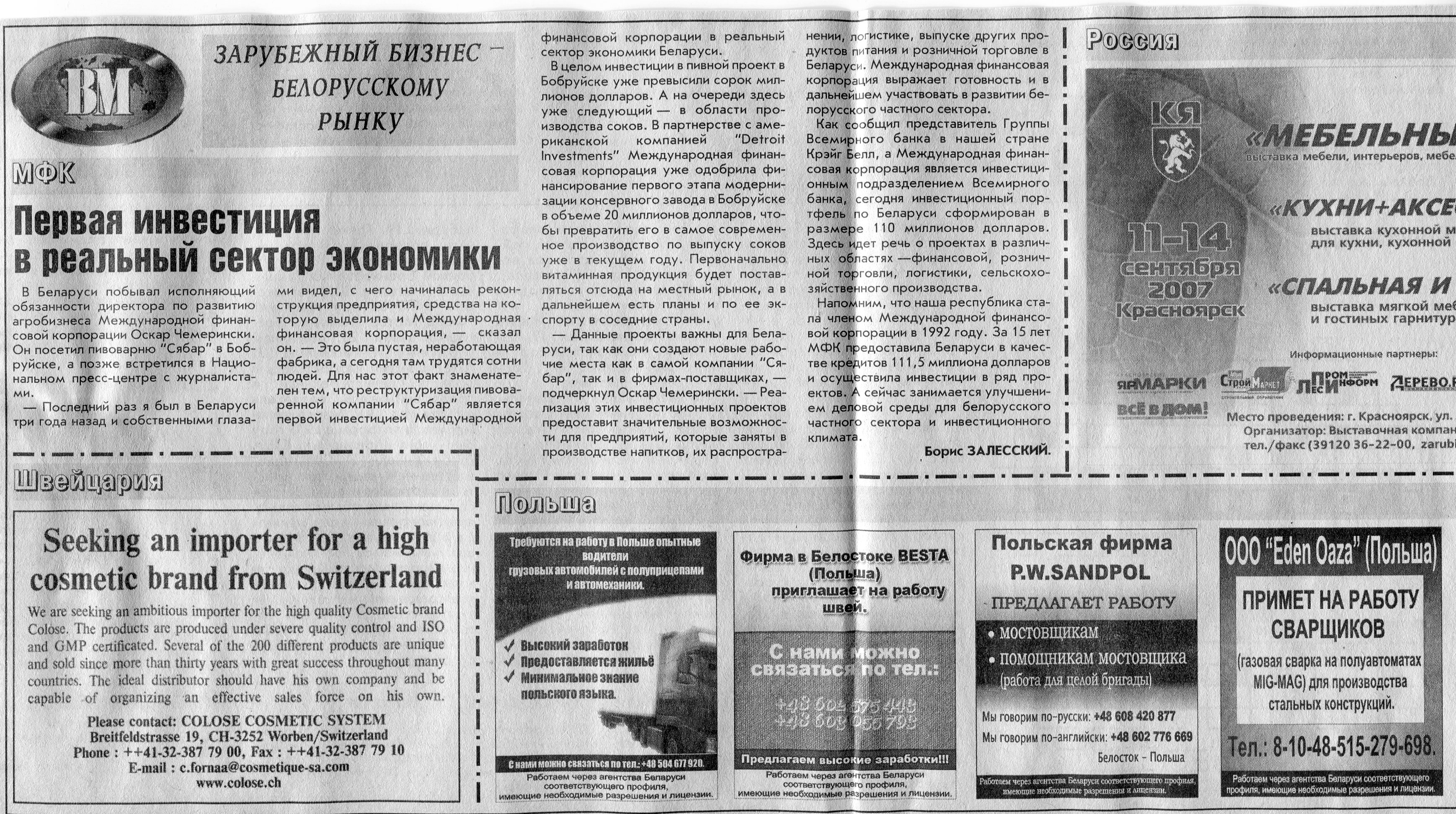 Зарубежный бизнес - белорусскому рынку // Вечерний Минск. - 2007. - 31 авг.