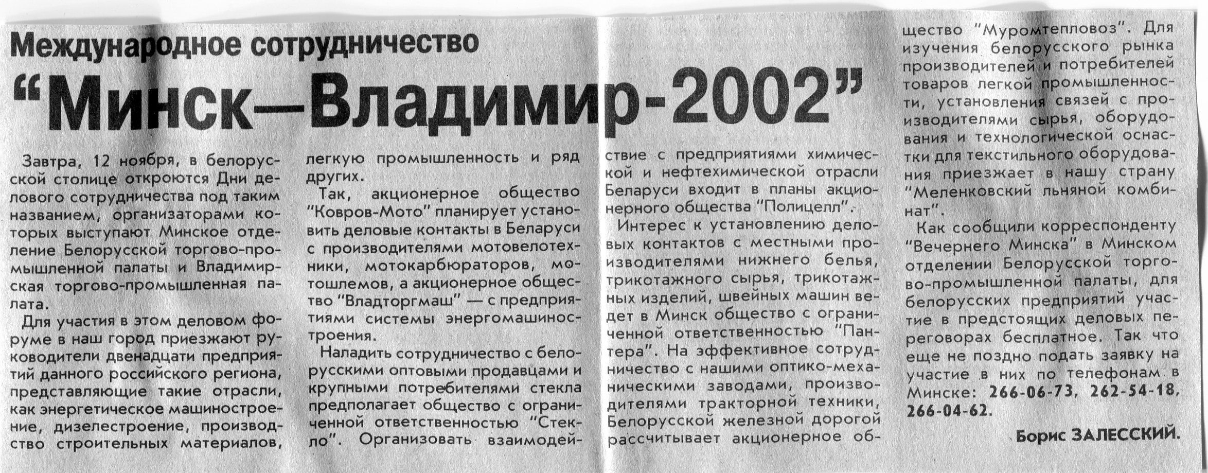 Залесский, Б. "Минск - Владимир - 2002" / Б. Залесский // Вечерний Минск. - 2002. - 11 нояб.