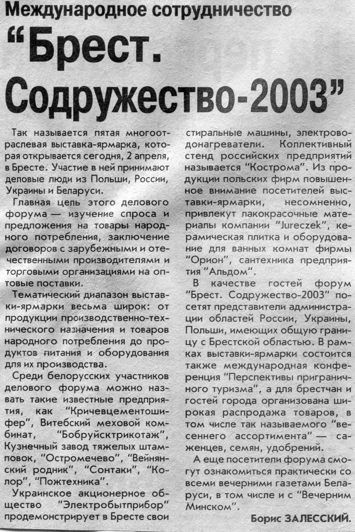 Залесский, Б. "Брест. Содружество-2003" / Б. Залесский // Вечерний Минск. – 2003. – 2 апр.