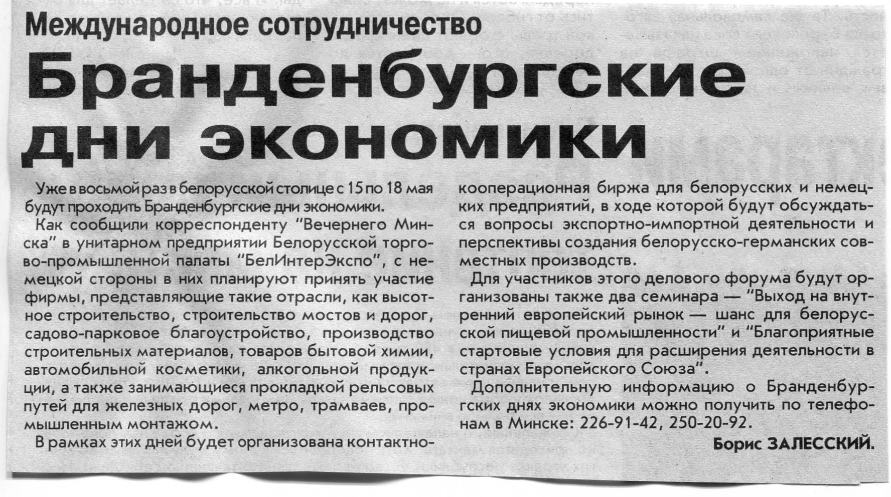 Залесский, Б. Бранденбургские дни экономики / Б. Залесский // Вечерний Минск. - 2003. - 15 апр.