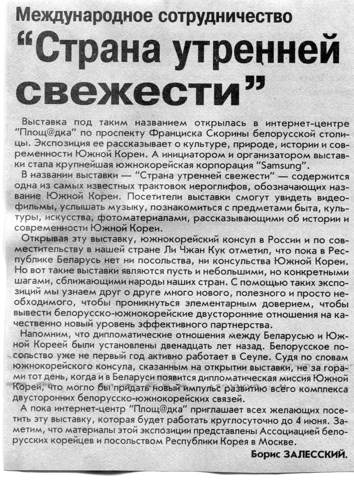 Залесский, Б. "Страна утренней свежести" / Б. Залесский // Вечерний Минск. - 2003. - 16 апр.