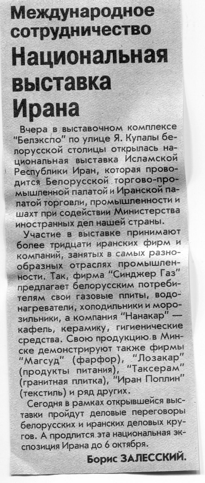 Залесский, Б. Национальная выставка Ирана / Б. Залесский // Вечерний Минск. - 2002. - 1 окт.