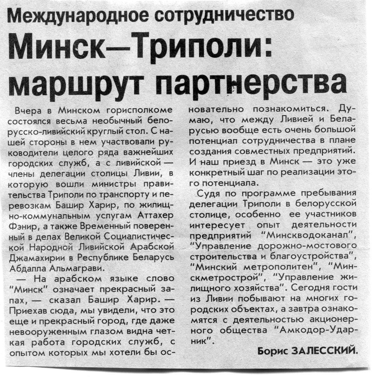 Залесский, Б. Минск - Триполи: маршрут партнерства / Б. Залесский // Вечерний Минск. - 2003. - 19 мар.