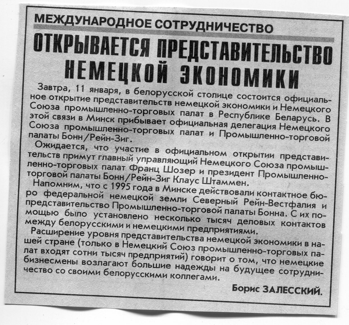 Залесский, Б. Открывается Представительство немецкой экономики / Б. Залесский // Вечерний Минск. - 2001. - 10 янв.