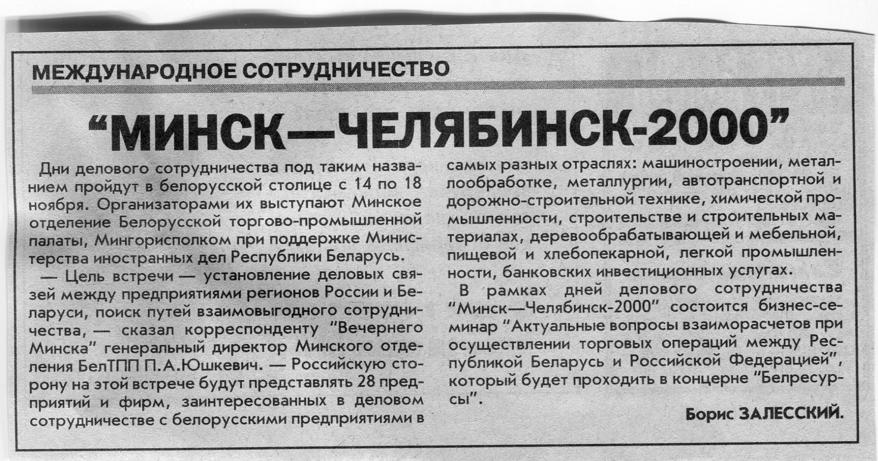 Залесский, Б. "Минск - Челябинск - 2000" / Б. Залесский // Вечерний Минск. - 2000. - 14 нояб.