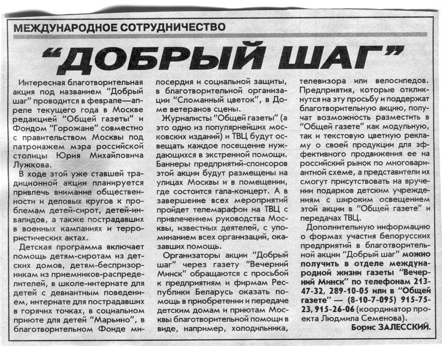 Залесский, Б. "Добрый шаг" / Б. Залесский // Вечерний Минск. - 2001. - 7 февр.