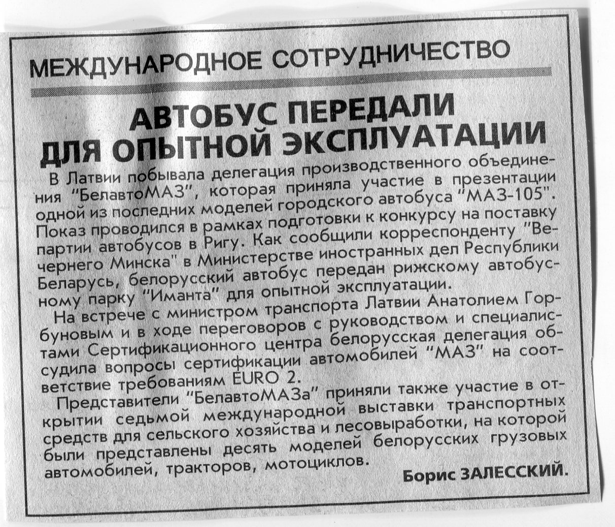 Залесский, Б. Автобус передали для опытной эксплуатации / Б. Залесский // Вечерний Минск. - 2000. - 15 сент.