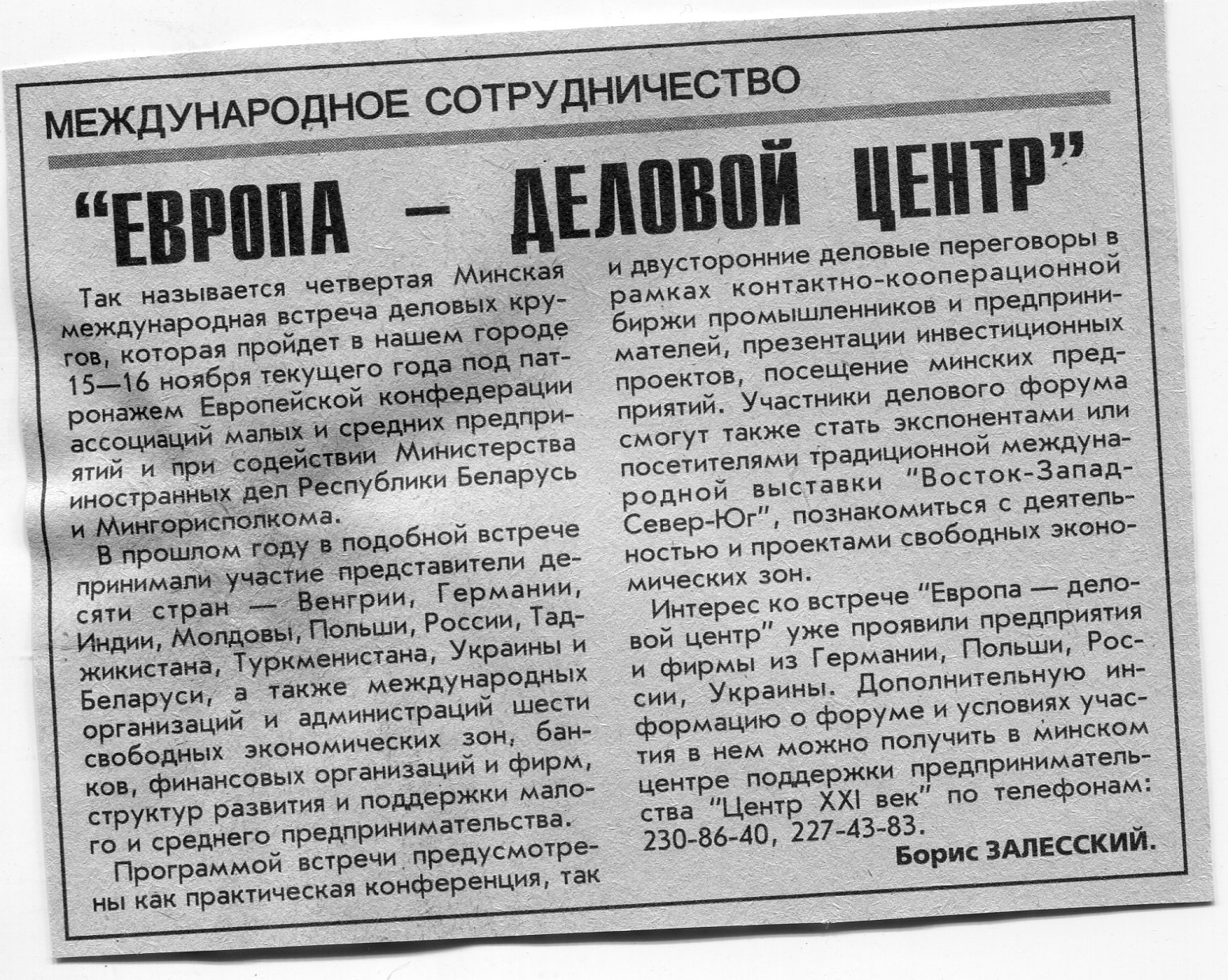 Залесский, Б. "Европа - деловой центр" / Б. Залесский // Вечерний Минск. - 2000. - 9 авг.