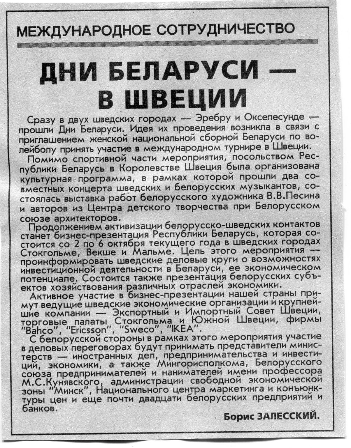 Залесский, Б. Дни Беларуси - в Швеции / Б. Залесский // Вечерний Минск. - 2000. - 27 сент.