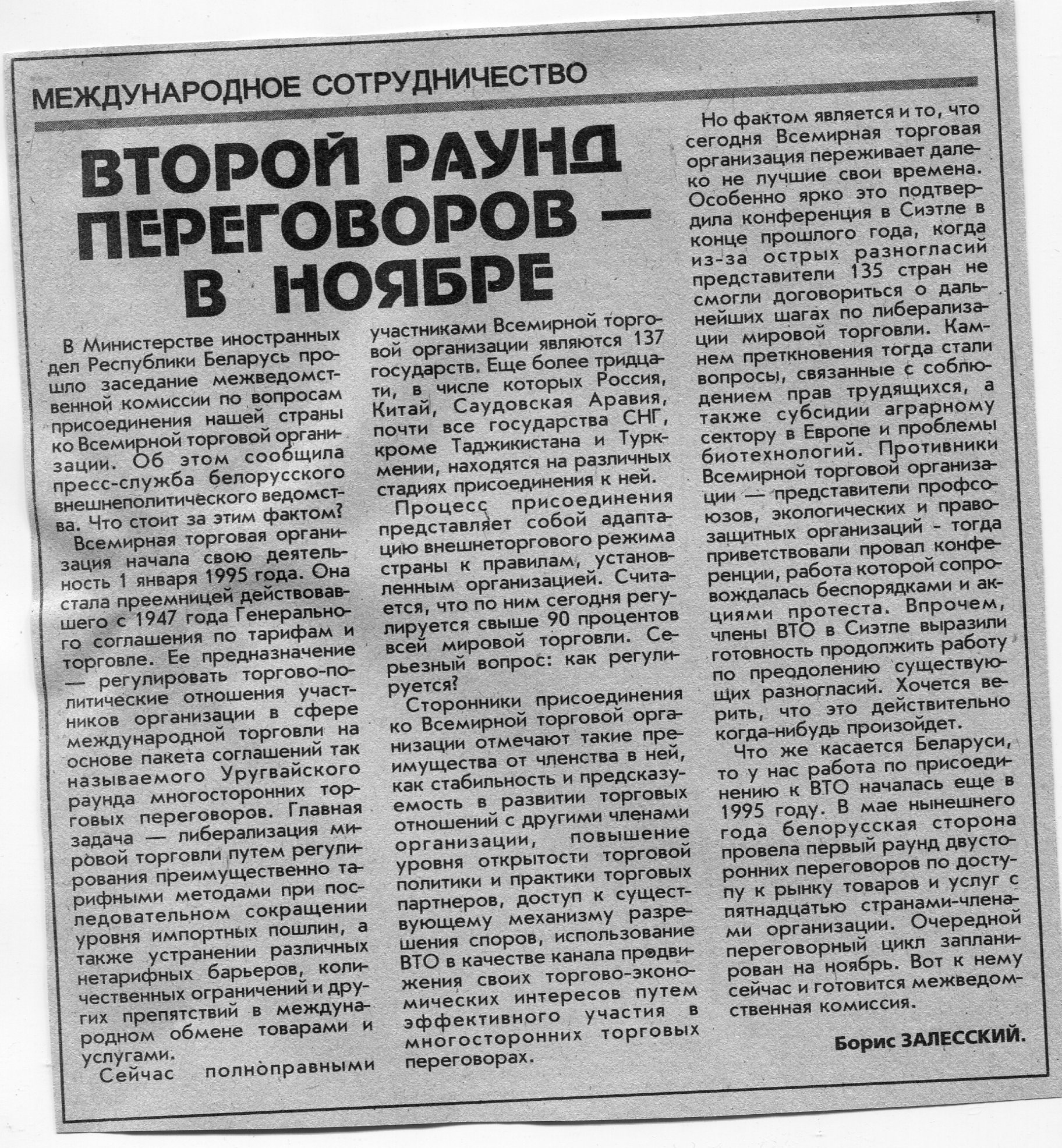 Залесский, Б. Второй раунд переговоров - в ноябре / Б. Залесский // Вечерний Минск. - 2000. - 18 июл.