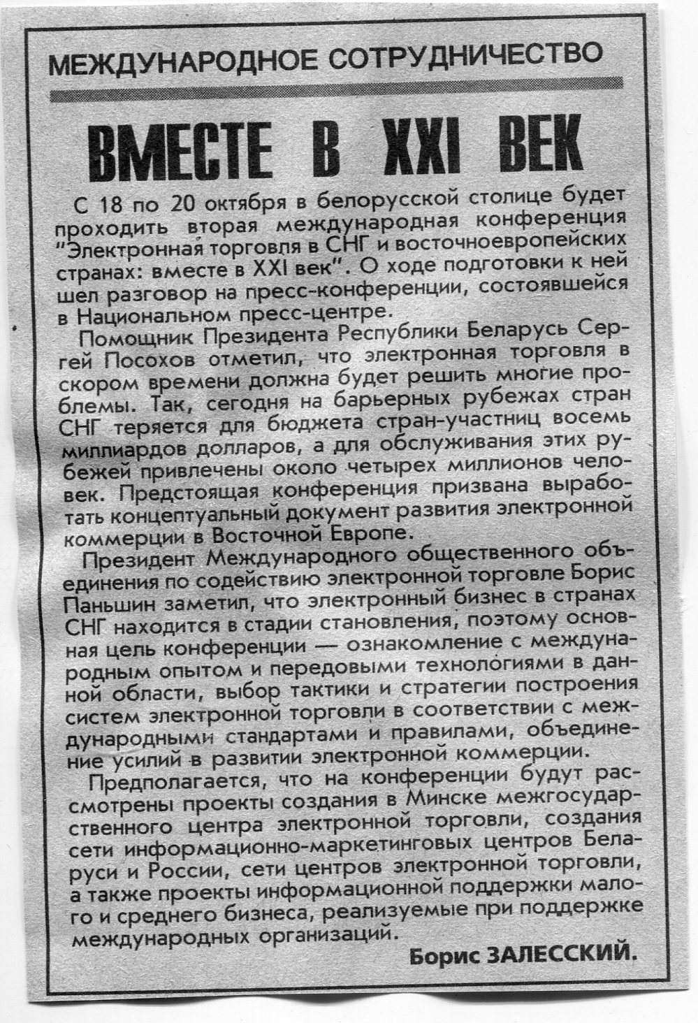 Залесский, Б. Вместе в XXI век / Б. Залесский // Вечерний Минск. - 2000. - 11 сент.