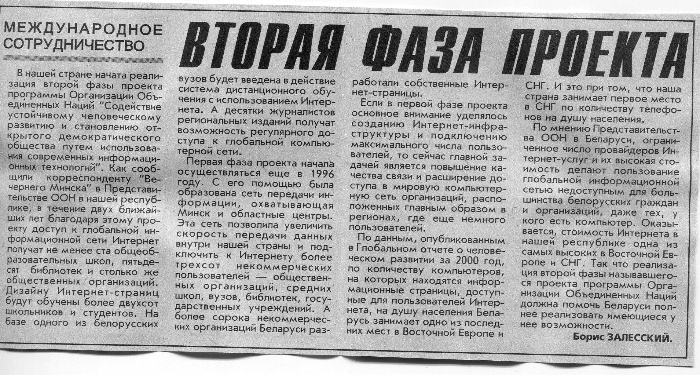 Залесский, Б. Вторая фаза проекта / Б. Залесский // Вечерний Минск. - 2000. - 1 авг.
