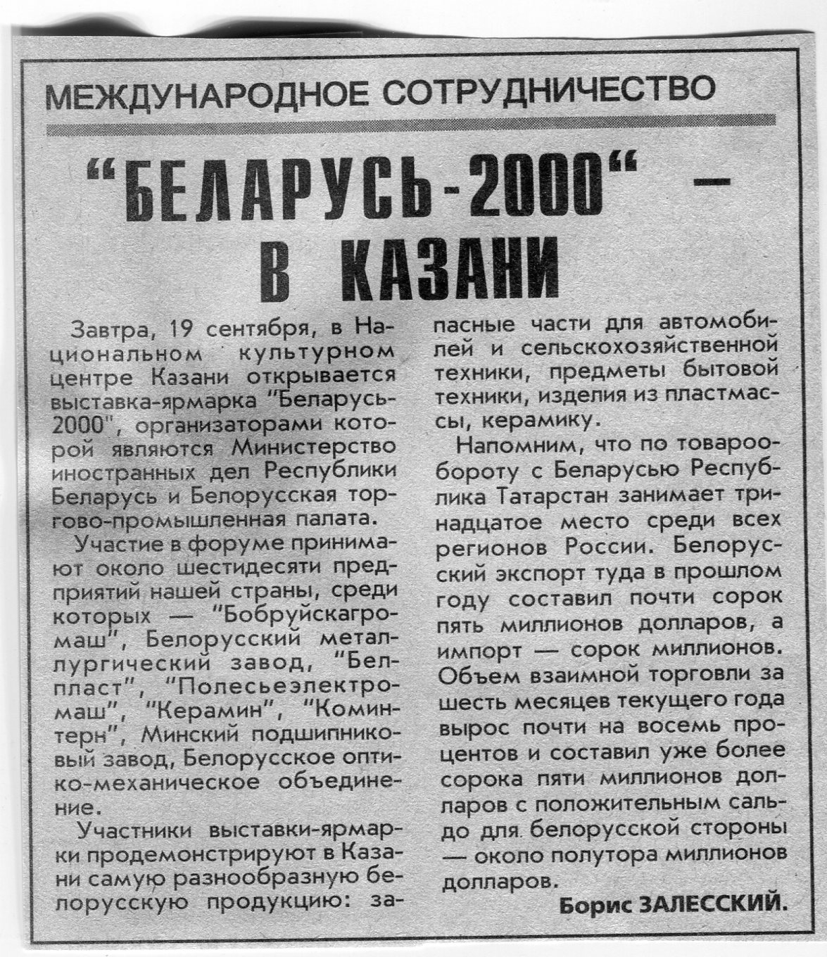 Залесский, Б. "Беларусь-2000" - в Казани / Б. Залесский // Вечерний Минск. - 2000. - 18 сент.