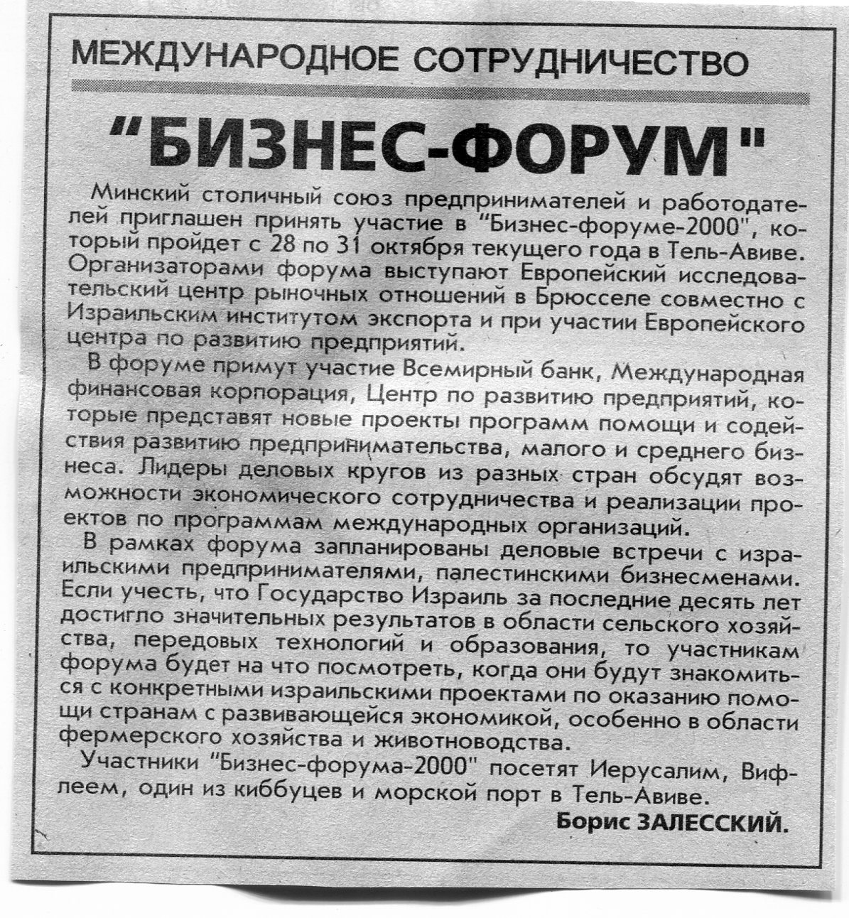 Залесский, Б. "Бизнес-форум" / Б. Залесский // Вечерний Минск. - 2000. - 6 окт.